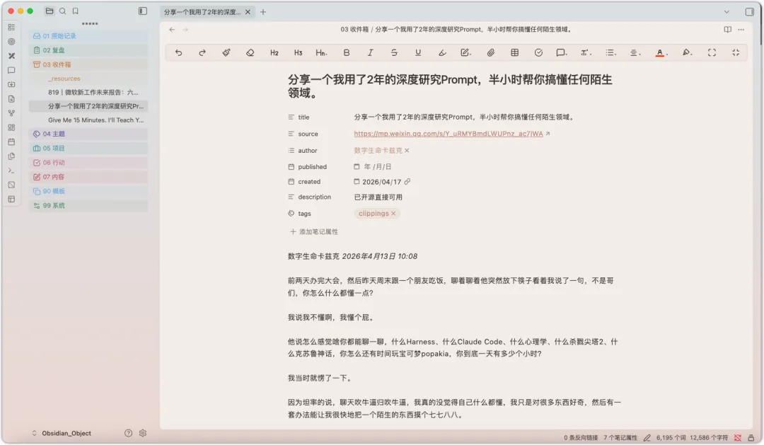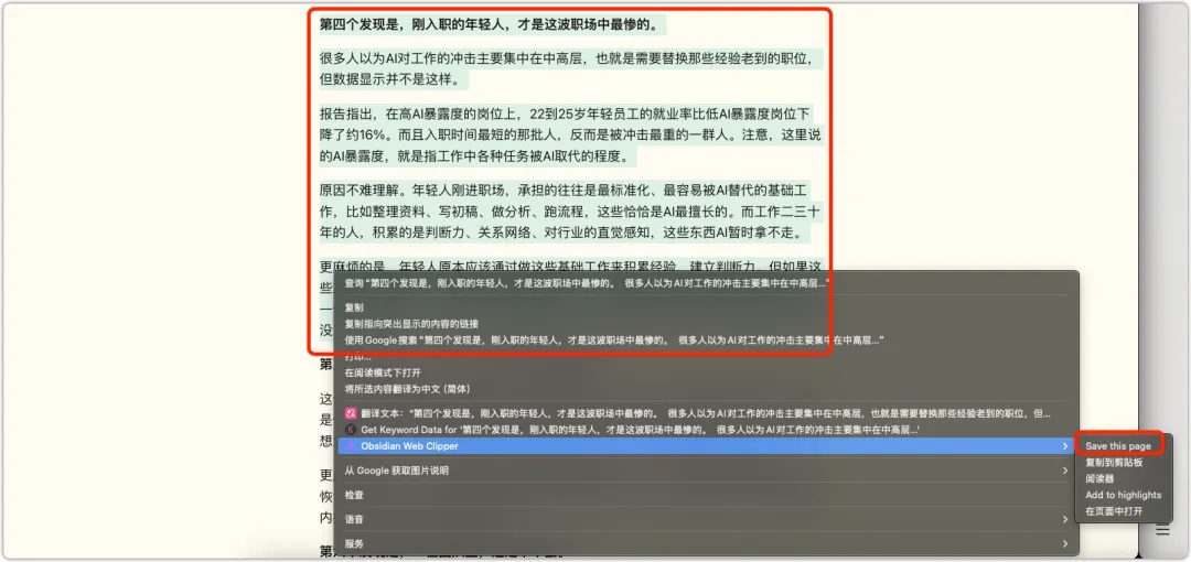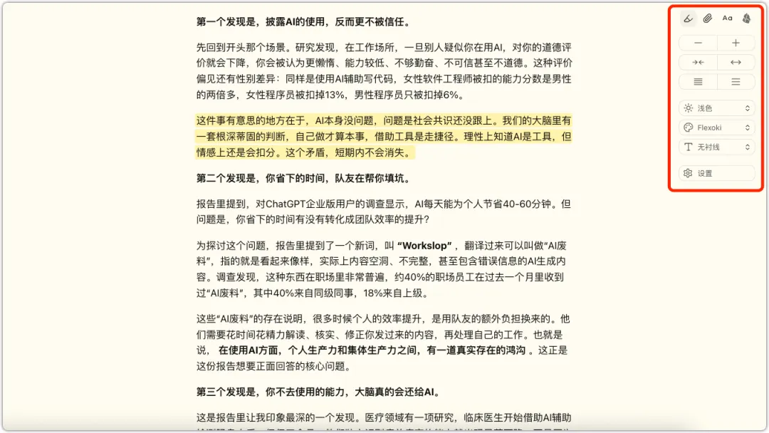 平时看长文,这个模式很实用。 也可以边看边对重点内容做高亮操作。高亮过的部分,保存到本地 Obsidian 也会带上。