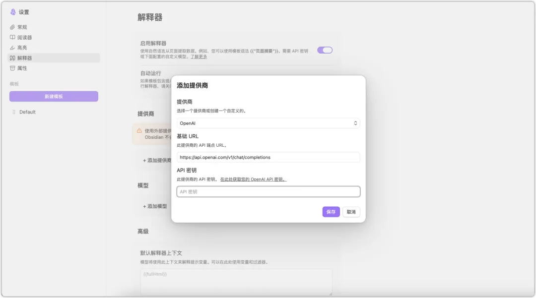 有个解释器的功能。先把自己的 AI 提供商和模型配好。API key 接进去。然后自己预设一些处理规则就闭环啦。