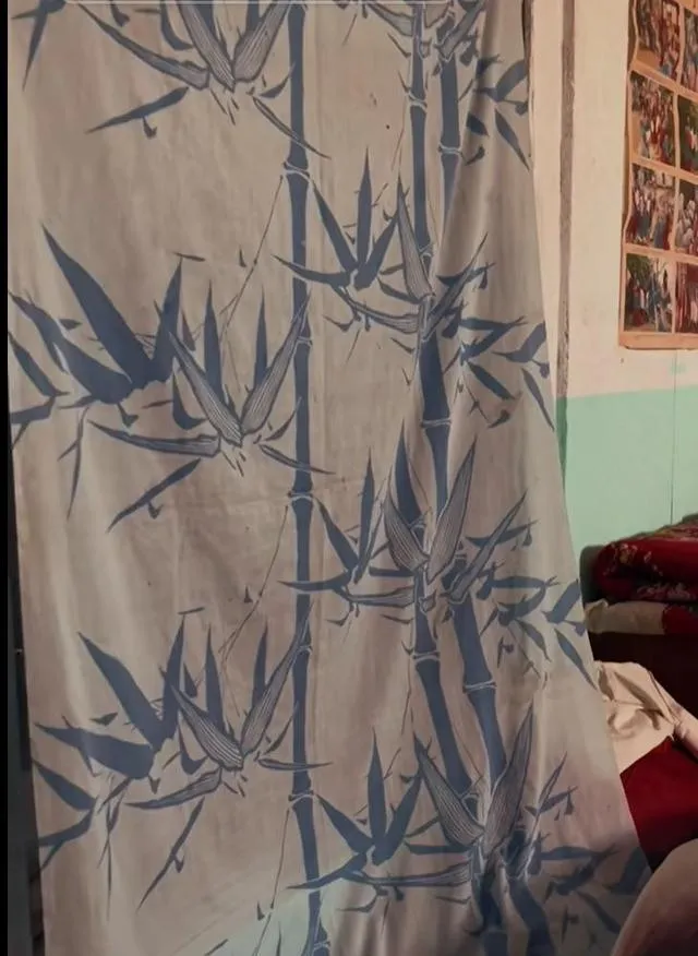 这张,图里这蓝色竹叶的布帘,家里都叫它窗帘,那会儿九成九农村人家都是一水这种风格,厚实,花纹鲜亮,拉开就能见着里屋,布边永远有点卷,摸上去不算顺滑,过年换新帘,老一辈还要比谁家印得花齐,风一吹,帘子晃荡,小时候拿它当背景,还拍过“全家福”,现在各种高档卷帘,谁还想着这种低调又实用的老家什。