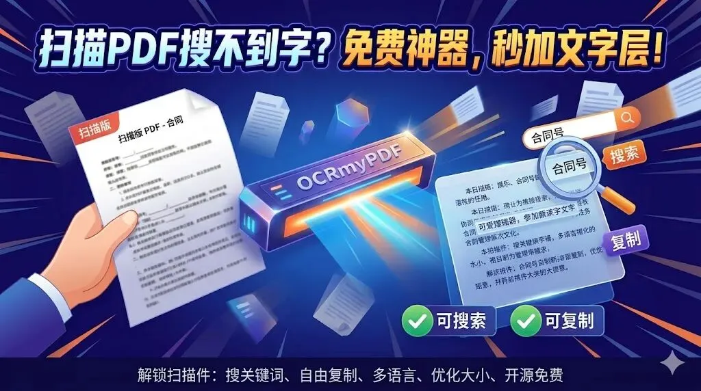 其实扫描文件本质就是图片堆起来的,里面没有电脑能读的文字信息。OCRmyPDF这个开源工具直接给它补上OCR文字层,文件立刻就能搜索、复制粘贴。最关键的是,它把文字精准叠在原图下面,视觉上几乎看不出变化,操作完还能保留甚至优化文件大小。