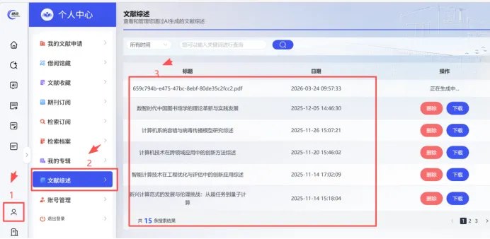 文献综述并截图:使用平台进行文献综述,截图个人中心文献综述相关页面。