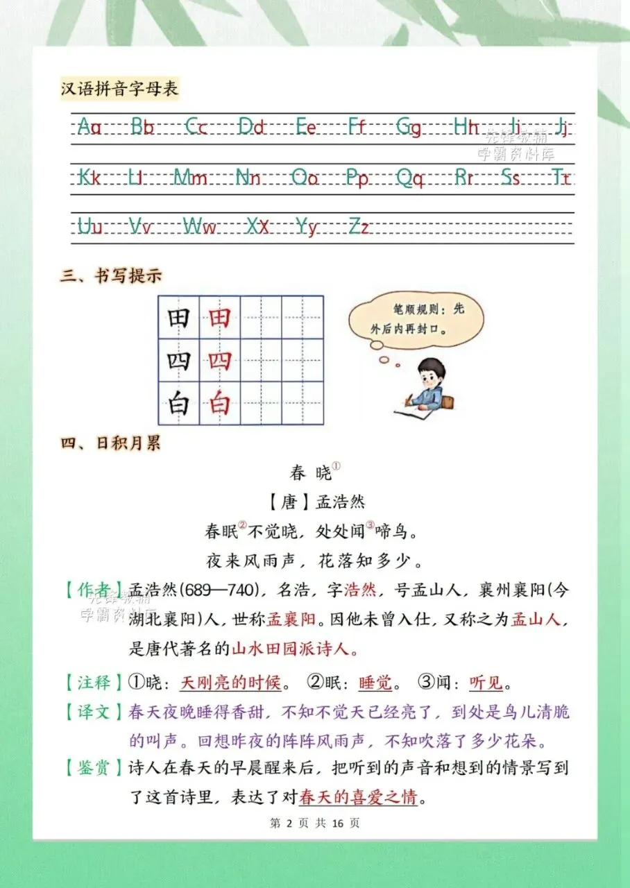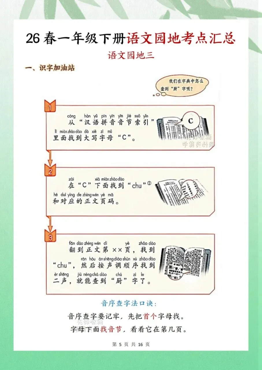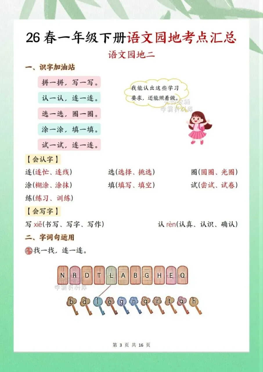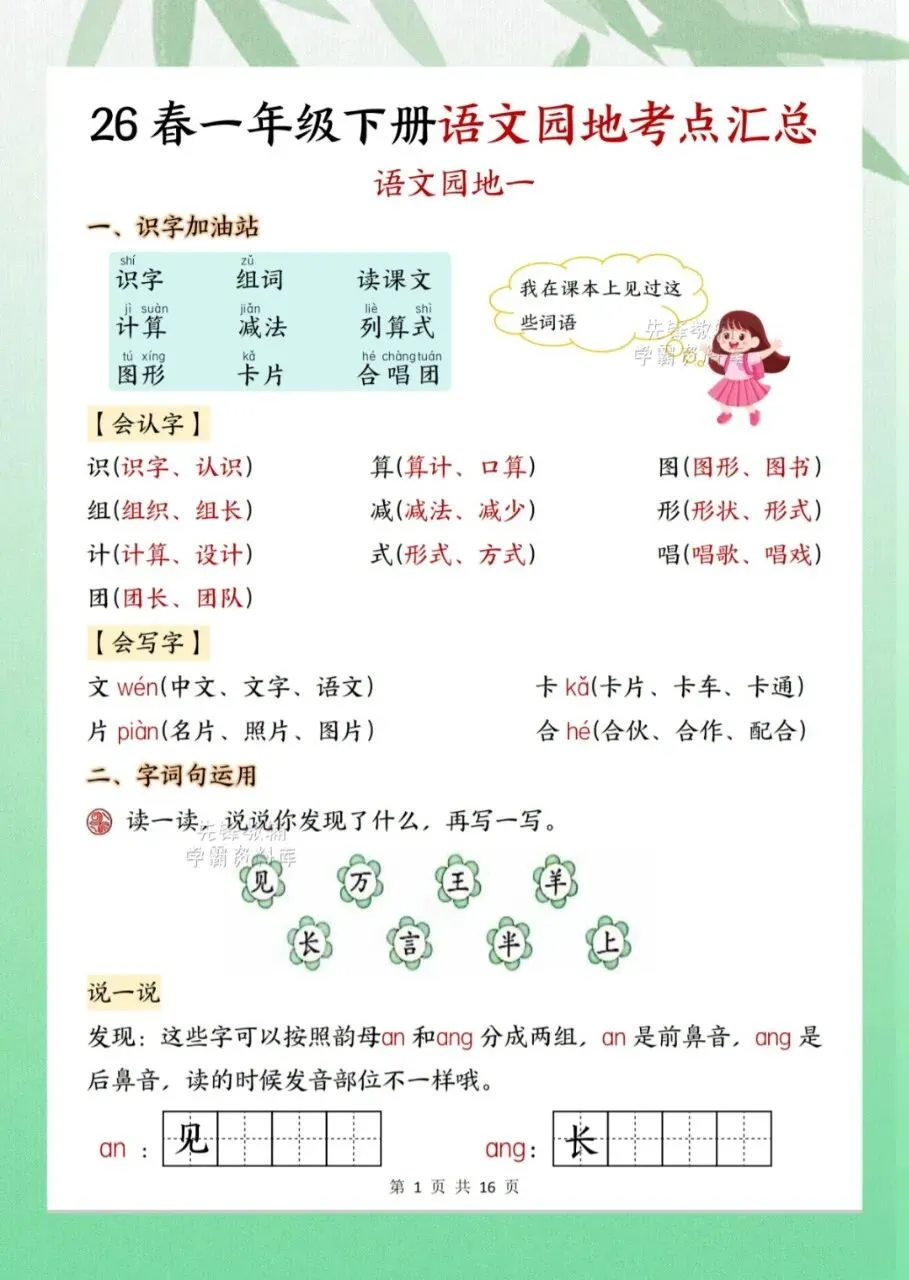 今日分享2026春一年级下册语文语文园地考点汇总共计 16 页。语文园地考点汇总将书里的知识考点汇总包含识字加油站、字词句运用、书写提示、日积月累内容,需要的家长抓紧打印出来,让孩子在利用课余学一学、背一背,扎实基础。