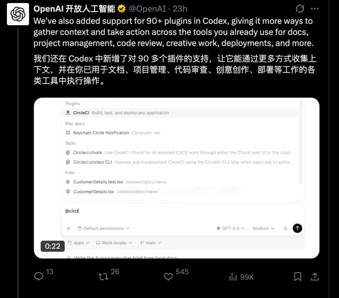 4. 生态扩展 Mac App + CLI + IDE插件 + 网页端全覆盖;90+插件打通主流开发工具链,云端与本地无缝切换。