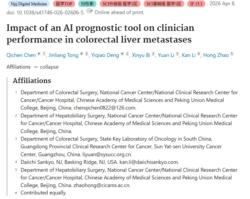 Chen Q, Tong J, Deng Y, Bi X, Li Y, Li K, Zhao H. Impact of an AI prognostic tool on clinician performance in colorectal liver metastases. NPJ Digit Med. 2026 Apr 8. doi: 10.1038/s41746-026-02606-5. Epub ahead of print. PMID: 41951838.