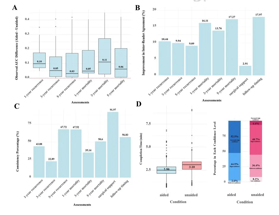 主要终点为辅助与无辅助条件下,预测3年死亡率的受试者工作特征曲线下面积(Area Under the Receiver Operating Characteristic Curve, AUC-ROC)差值。次要终点包括1年及5年死亡率、各时间节点复发率的AUC-ROC差值,以及各时间节点的灵敏度(Sensitivity)和特异度(Specificity)差值,及读者间信度(Inter-Rater Reliability)。探索性终点包括治疗与随访建议的读者间信度、决策信心差值及评估耗时。统计分析采用Obuchowski-Rockette(OR)方法,将读者与病例均作为随机效应,以确保结果的可推广性。