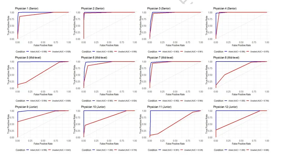 然而,本研究亦存在若干局限性:探索性问卷缺乏正式的心理测量学验证;单中心设计制约了结论的外推性;研究基于回顾性病例而非真实前瞻性诊疗,无法评估医师决策对下游患者结局的实际影响;对AI工具的长期采纳率与持续工作流影响亦未能评估。值得特别强调的是,研究者明确指出,在受控研究条件下观察到的临床医师表现提升,与确立该工具临床实用性(Clinical Utility)之间仍有本质差距——后者需要前瞻性真实世界研究,以可测量的患者结局为终点加以确认。本研究作为从统计模型验证迈向真实世界实施研究的中间步骤,为人机协作效能的评价方法学提供了可参考的范式,并为后续更大规模、多中心、以患者为中心的前瞻性验证研究奠定了基础。