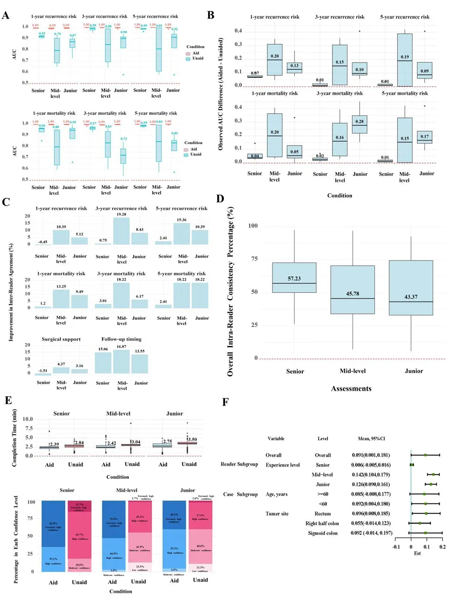 本研究在严格的随机MRMC框架下,首次系统证明了一款基于机器学习的CRLM预后工具能够显著改善临床医师的预后判断准确性,并在探索性分析中表现出提升决策效率与信心的潜力。AUC改善主要由灵敏度提升驱动,提示该工具在帮助临床医师识别高危患者、避免漏判方面具有特定优势。模型辅助还使读者间一致率明显提高,有望减少因临床经验差异导致的诊疗决策变异,促进患者管理的标准化。工具带来的”双赢”效益——缩短决策时间的同时提升决策信心——有效针对临床采纳的两大核心障碍:流程干扰与决策不确定性。从受益群体看,初级医师的获益最为显著,提示该工具可发挥”数字导师”的作用,帮助经验不足的外科肿瘤医师加速向高级医师的表现水平靠拢;中级医师则受益于评估一致性的改善。