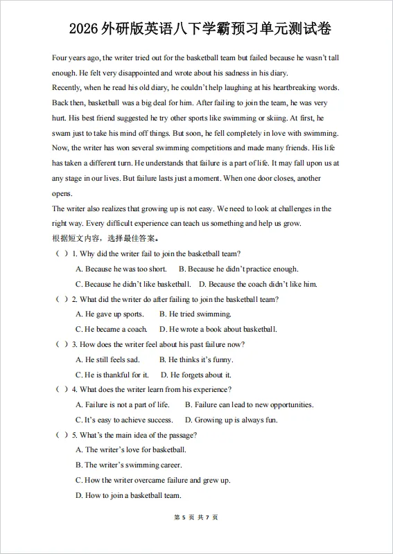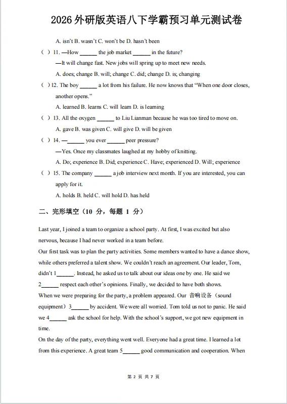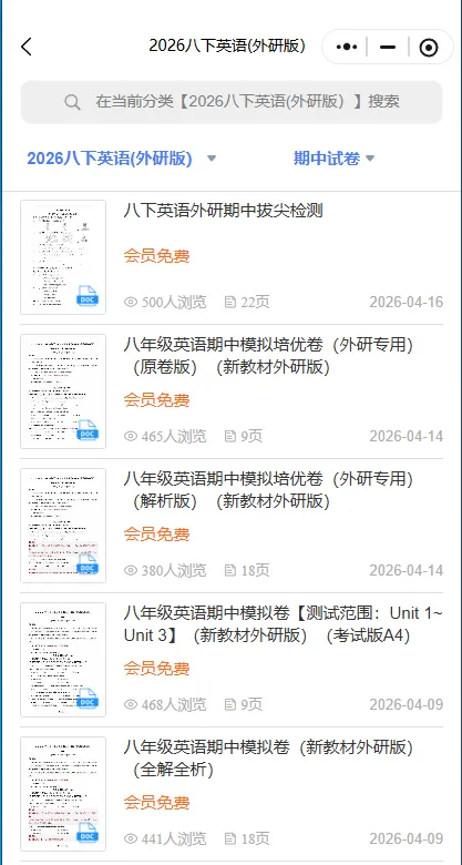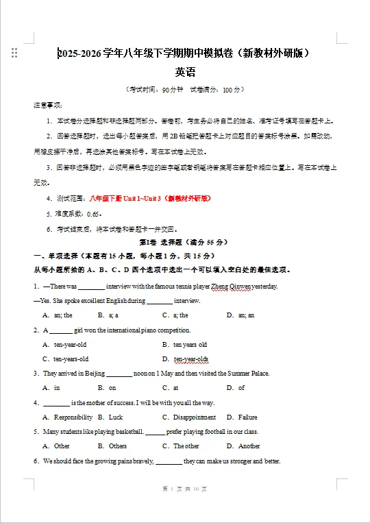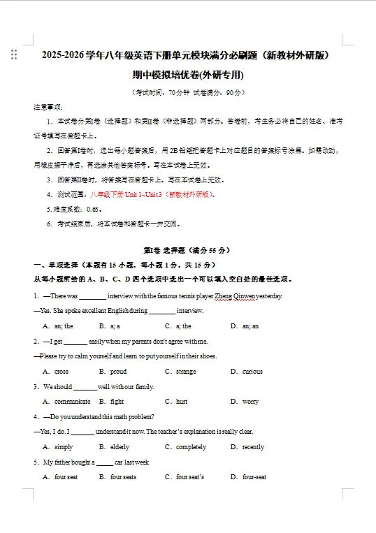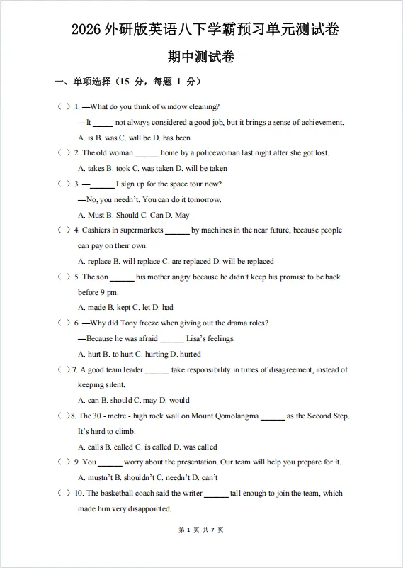 冲刺期中——2026年新版八年级下册外研版英语《期中测试卷》有多套,有Word版可修改,有答案解析,电子版可下载可打印。可以帮助学生全面巩固知识、提升应试能力、查漏补缺并培养自主学习习惯。
