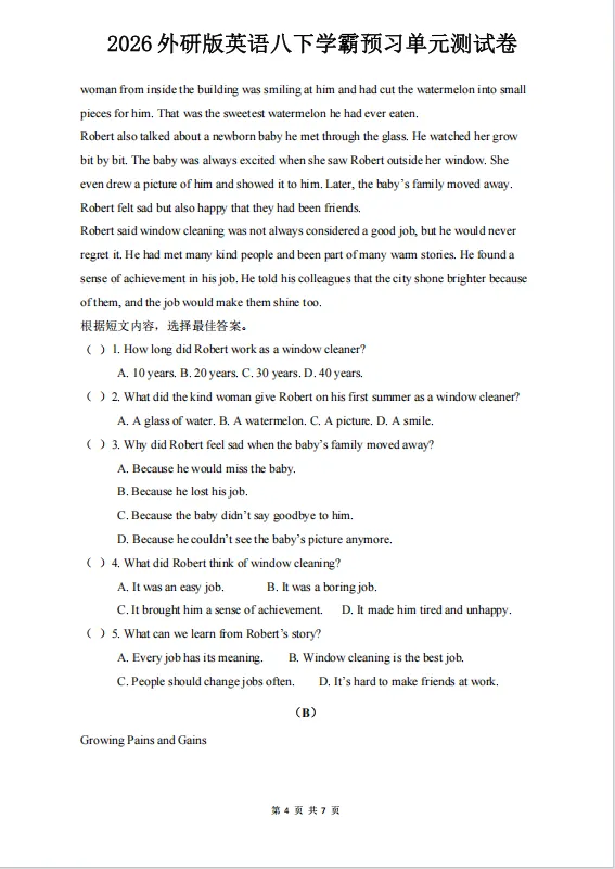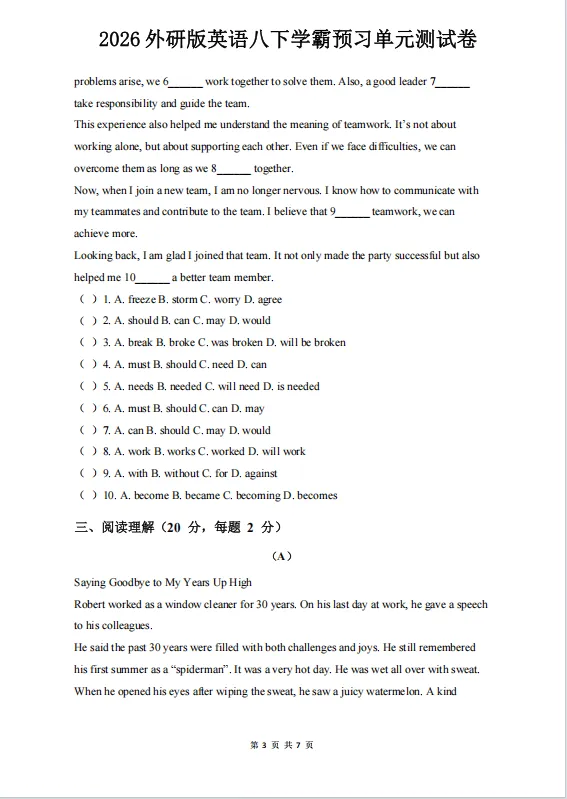 冲刺期中——2026年新版八年级下册外研版英语《期中测试卷》有多套,有Word版可修改,有答案解析,可下载可打印