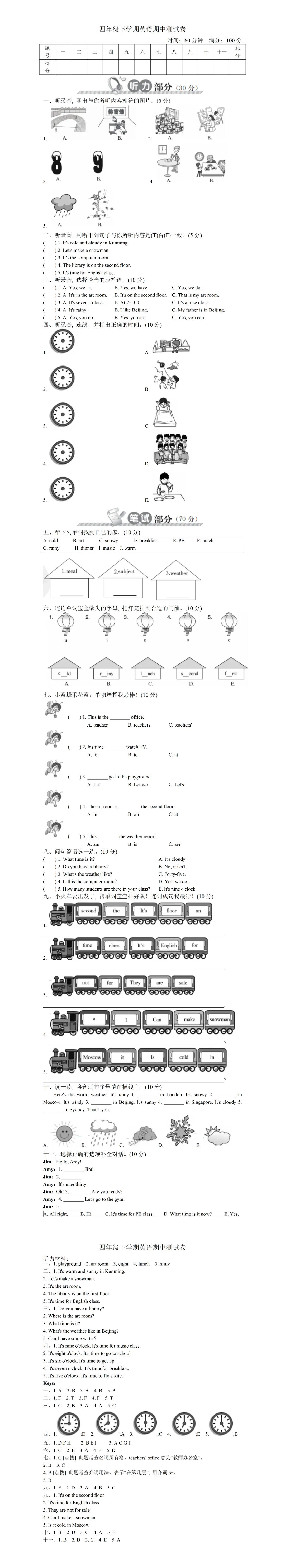 2026春人教PEP版四年级下册英语《期中质量检测卷 3套》,电子版可打印