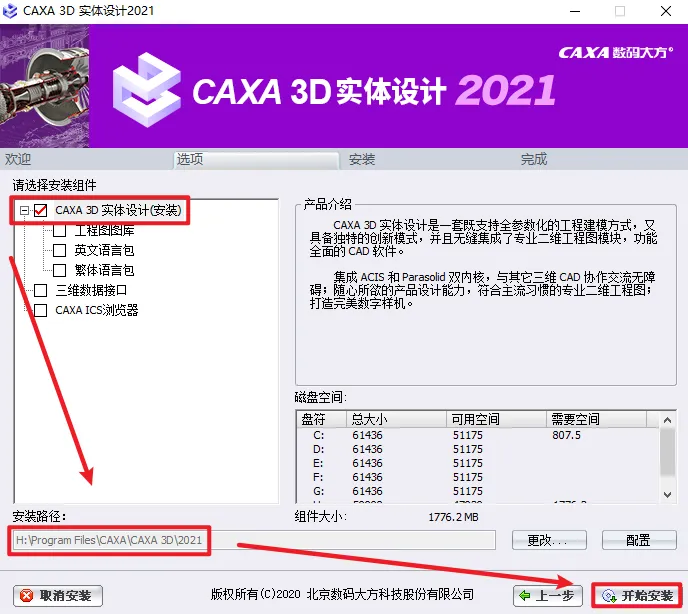 5.选择勾选“需要安装的组件”,选择软件的安装路径,安装路径不要出现中文,点击“开始安装”