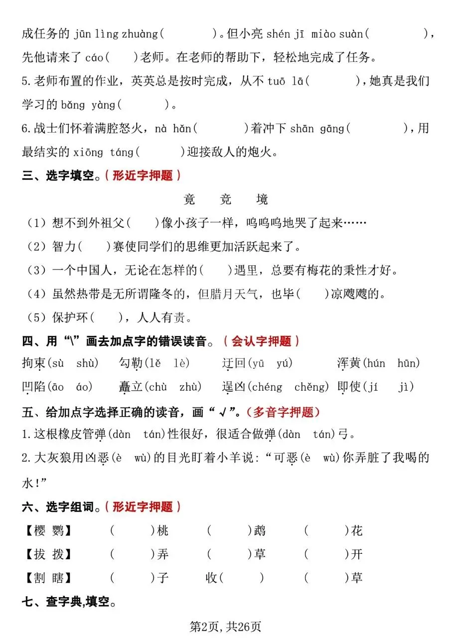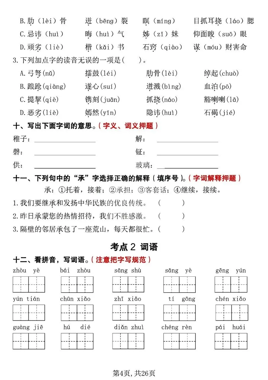 这是五年级下册语文期中复习专项押题资料,涵盖汉字、词语、句子、课文积累、课内阅读、课外阅读六大高频考点,含字音字形、成语、仿写、病句、古诗默写、名著与课文阅读理解等题型,附完整答案,针对性强,适合期中冲刺提分。