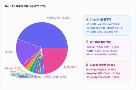 🔹 ChatGPT:市场份额从52.85%骤降至44.23%,首次跌破45%,访问量环比下滑6.5%。