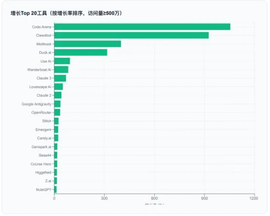 🔹 新入场者:Code Arena(+1054%)、Clawdbot(+925%)、Duck.ai(+317%)等新兴工具以爆发式增长拉动整体大盘。