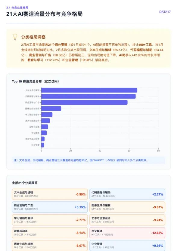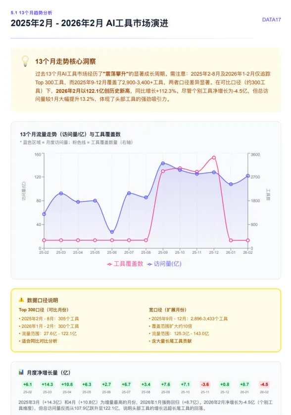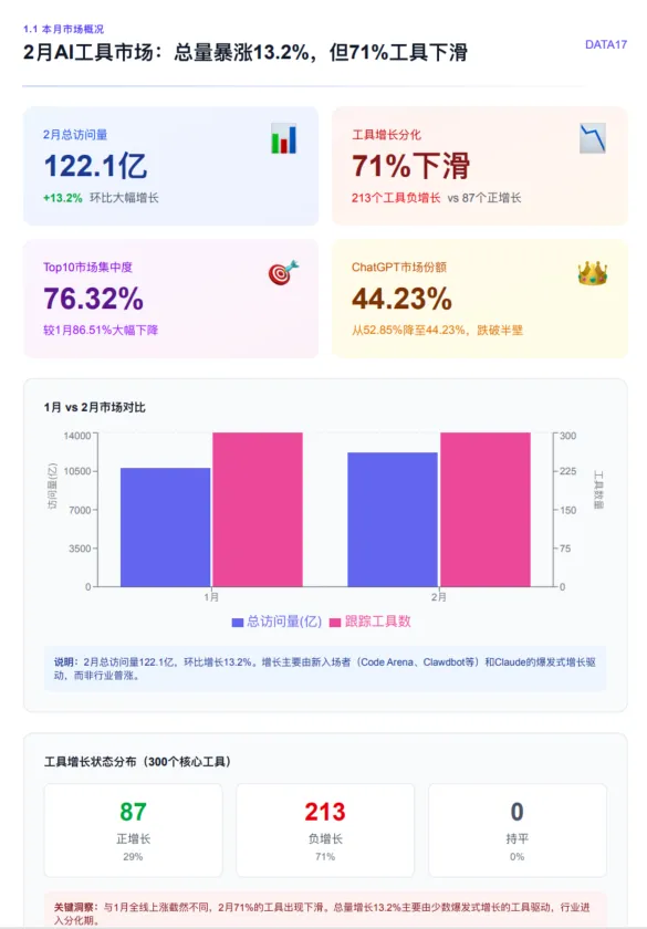 2026年2月,全球AI工具市场交出了一份“分裂感”极强的成绩单:总访问量122.1亿,环比大涨13.2%,但与此同时,71%的工具流量下滑,仅29%实现正增长。