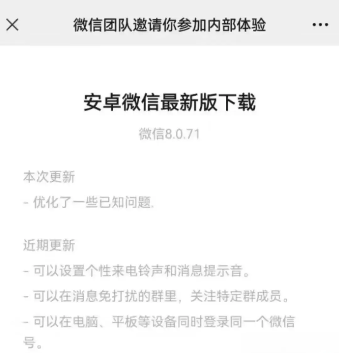 2026年4月微信安卓8.0.71内测版突然抢先iOS发布,这一反常节奏背后,是微信对内容生态的系统性重构。看似零散的功能调整,实则是在重新定义内容消费的底层逻辑,这是否会改变我们使用微信的习惯?