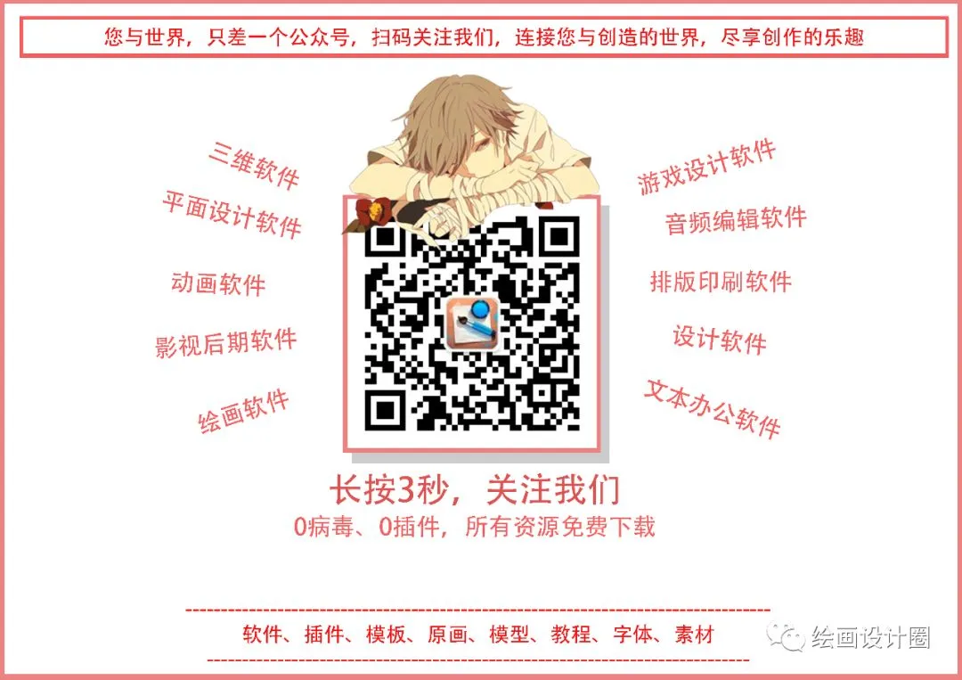 本公众号(绘画设计圈)所提供的软件、原画、插件以及字体和各种模板、脚本和源文件等资源全部来源于网络分享资源,仅供下载学习交流使用,请在24小时内删除,切勿用于一切的商业用途,因为商业使用产生的一切纠纷,本公众号(绘画设计圈)概不负责。 |