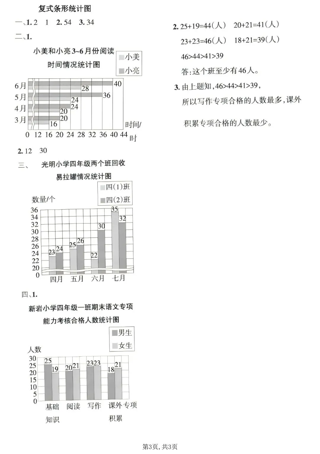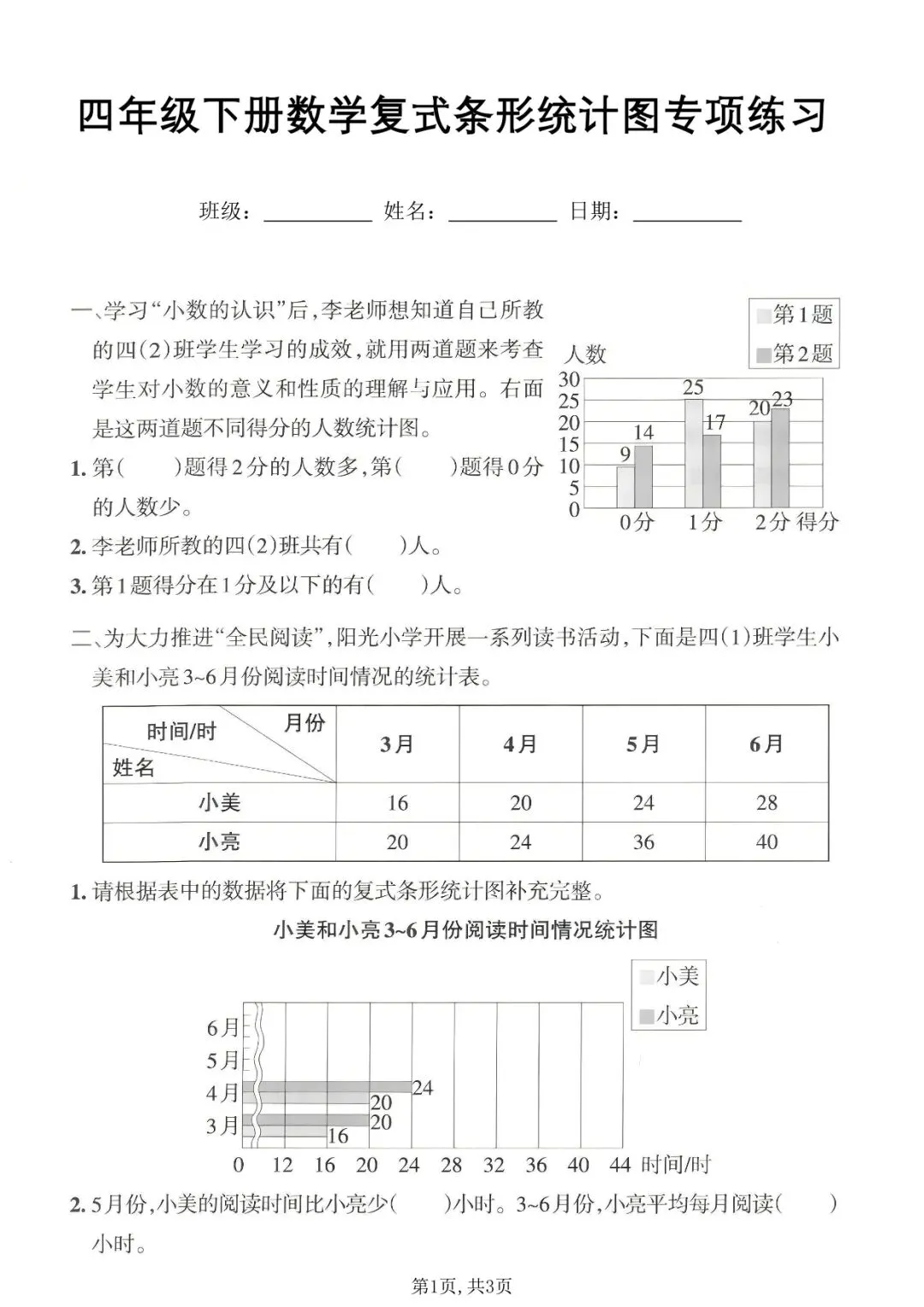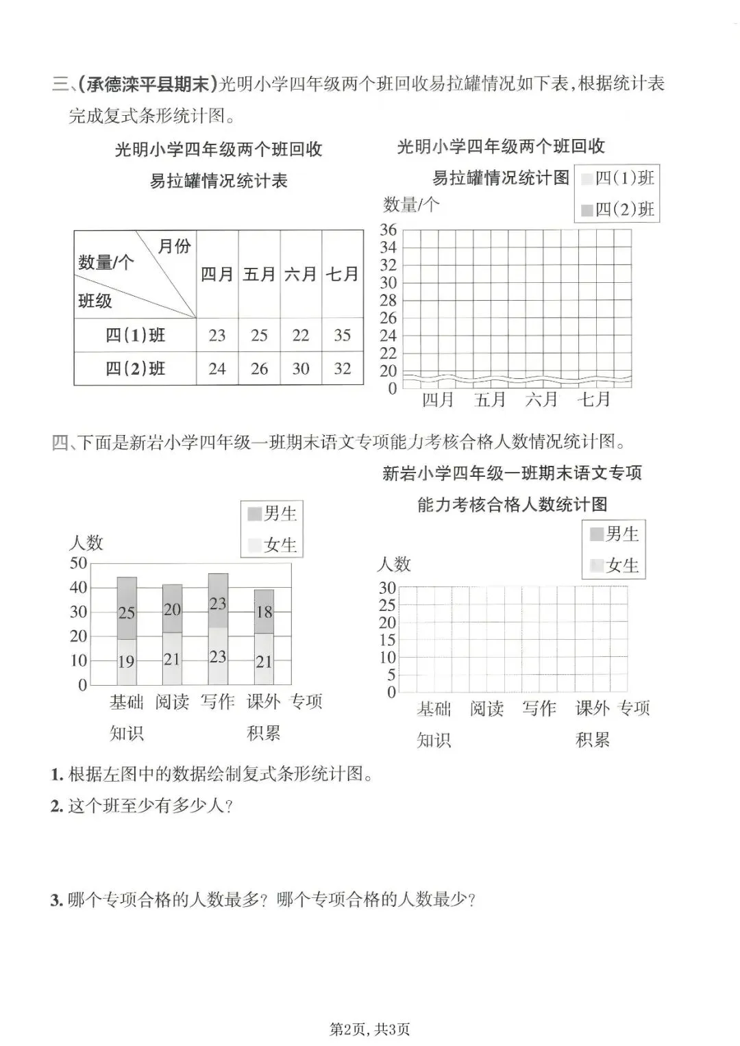 可下载丨四年级下册数学复式条形统计图专项练习,电子版可打印