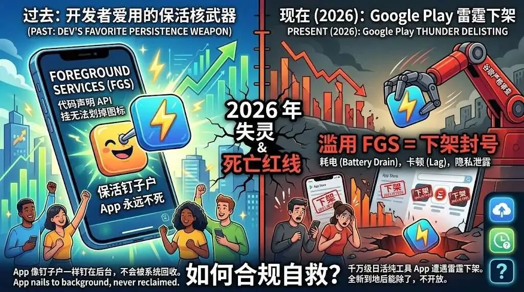 过去,开发者最爱用的保活核武器是 前台服务 (Foreground Services, FGS)。只要在代码里声明了这个 API,并在用户的手机通知栏挂一个无法划掉的“正在运行”的小图标,App 就能像钉子户一样死死钉在后台,永远不会被系统回收。 然而,在 2026 年的今天,这招不仅彻底失灵,反而变成了触发 Google Play 下架封号的“死亡红线”。谷歌为了彻底解决安卓手机耗电、卡顿以及隐私泄露的问题,对 FGS 祭出了史无前例的严格审查。大批千万级日活的纯工具 App 因为“滥用前台服务”在一夜之间遭遇雷霆下架。面对这场生存危机,出海开发者该如何合规自救?