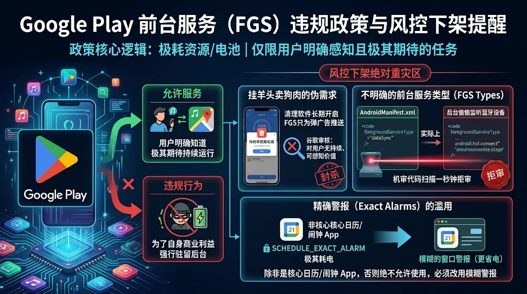 : 谷歌强制要求在 AndroidManifest.xml 中必须精确声明 FGS 的类型。如果你声明了 dataSync(数据同步),但代码实际上是在后台偷偷监听蓝牙设备,机审代码扫描一秒钟就能将你拒审。 - 精确警报 (Exact Alarms) 的滥用