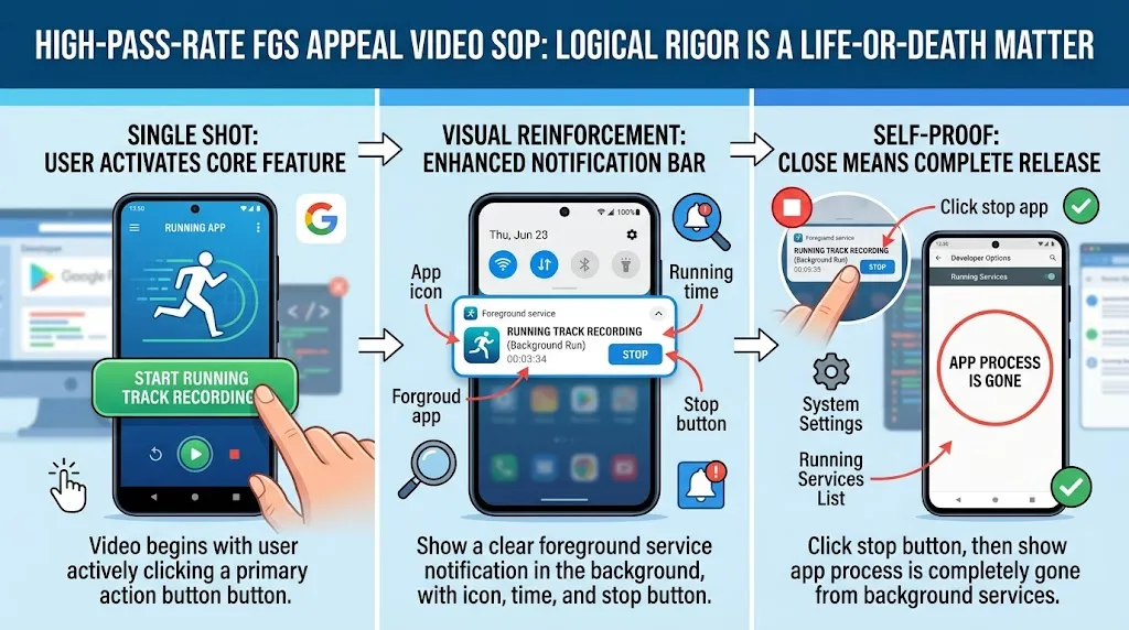 : 这是最关键的一步。在视频中,点击通知栏的“停止”按钮,然后打开安卓系统的“开发者选项 -> 正在运行的服务”,向审核员展示你的 App 进程已经彻底从后台消失。用实际行动证明你绝没有耍流氓赖在后台。