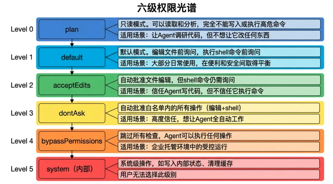 Claude Code的权限系统不是简单的“允许/拒绝”二元开关,而是一个五档信任光谱(加上一个内部级别共六级):