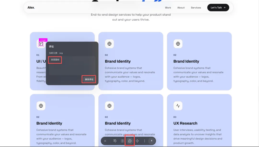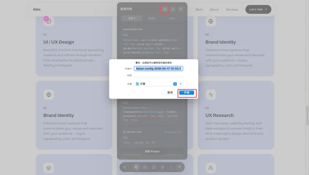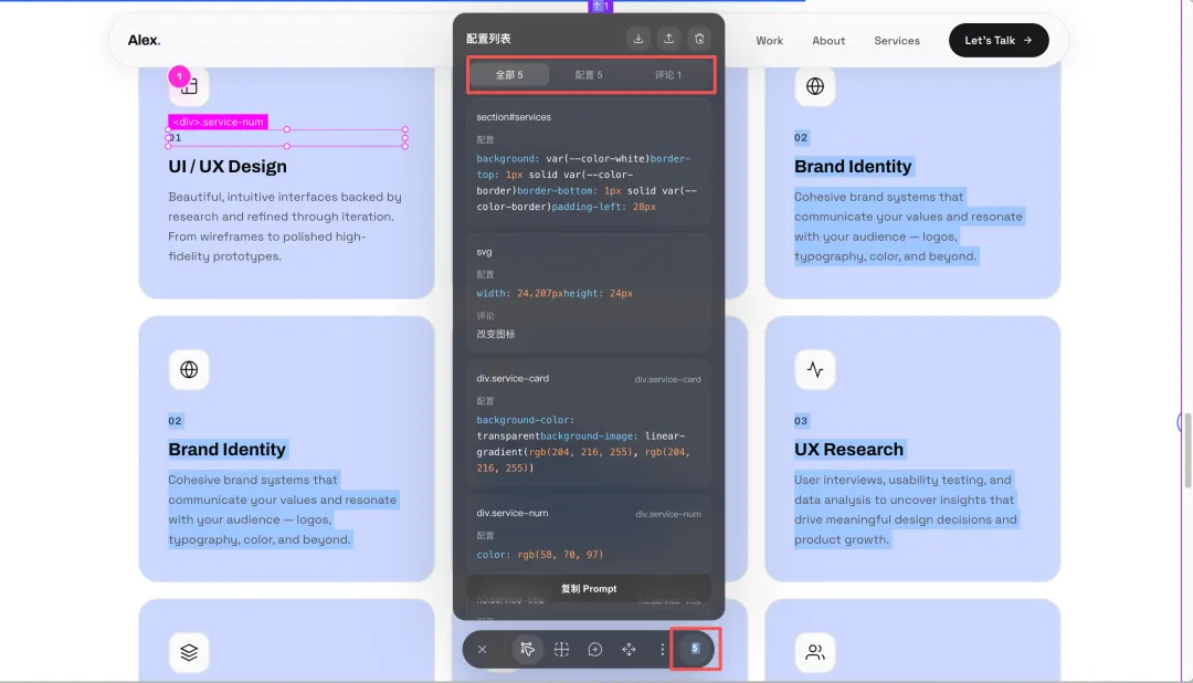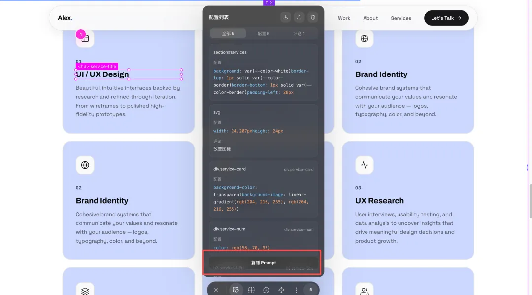 点击控件的最后一个按钮,你会看到,刚刚修改的内容都在这个配置列表中,比如刚刚的评论。然后我们点击【复制提示词】,把提示词发给对应的AI编程工具,它就会还原出你想要的效果或者如果你有对接的开发程序员,你也可以直接导出json文件发给他们修改。所以Liaison 解决的就是一个核心问题:让你不用再跟 AI 比划着说话。以前改个稿,要么截图圈一圈发给 AI 碰运气,要么自己翻代码找位置,折腾半天效果还不好。现在直接在页面上拖一拖、调一调,改完把提示词丢给 AI 就完事儿了,省心又精准。工具不难,门槛也低,装个插件几分钟就能搞定。如果你也经常用 AI 改设计改代码,真的建议试试,用过就回不去了。。今天的分享就到这里,希望对你有帮助!在日常的工作中,熟练掌握并组合使用这些优秀的工具,能极大提升我们的产出效率。如果你也希望系统地提升自己的设计能力,优化日常的设计工作流,欢迎订阅我的《UI/UX设计知识库》。在这里,我整理了自己多年积累的一线设计经验、实用的AI辅助设计技巧以及系统的组件规范。内容会持续更新,希望能帮助你构建更扎实的设计知识体系,从容应对工作中的各种设计需求。感兴趣的朋友可以点击下方链接了解详情,期待在知识库里与你相见👇👇永久买断!这套All in one的 UI / UX 设计知识库,可能是你今年最值的投资