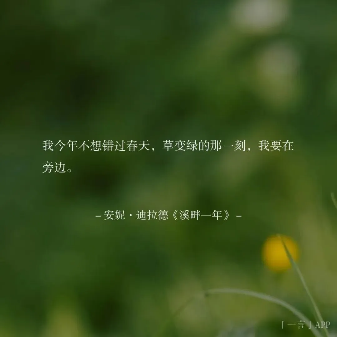 ●这句话出自安妮·迪拉德的自然文学经典 《听客溪的朝圣》(又译《溪畔天问》),它捕捉了一种极致的在场渴望——她不愿再通过回忆或想象去消费春天,而是决心像哨兵一样守候在自然现场,见证那几乎无法被肉眼捕捉的生命临界点。“草变绿的那一刻”并非漫长的渐变,而是大地意志的瞬间决断,她执意“要在旁边”,是将自己从时间的消费者还原为生命的目击者,以此对抗现代生活中那种麻木的、不断“错过”的生存惯性。