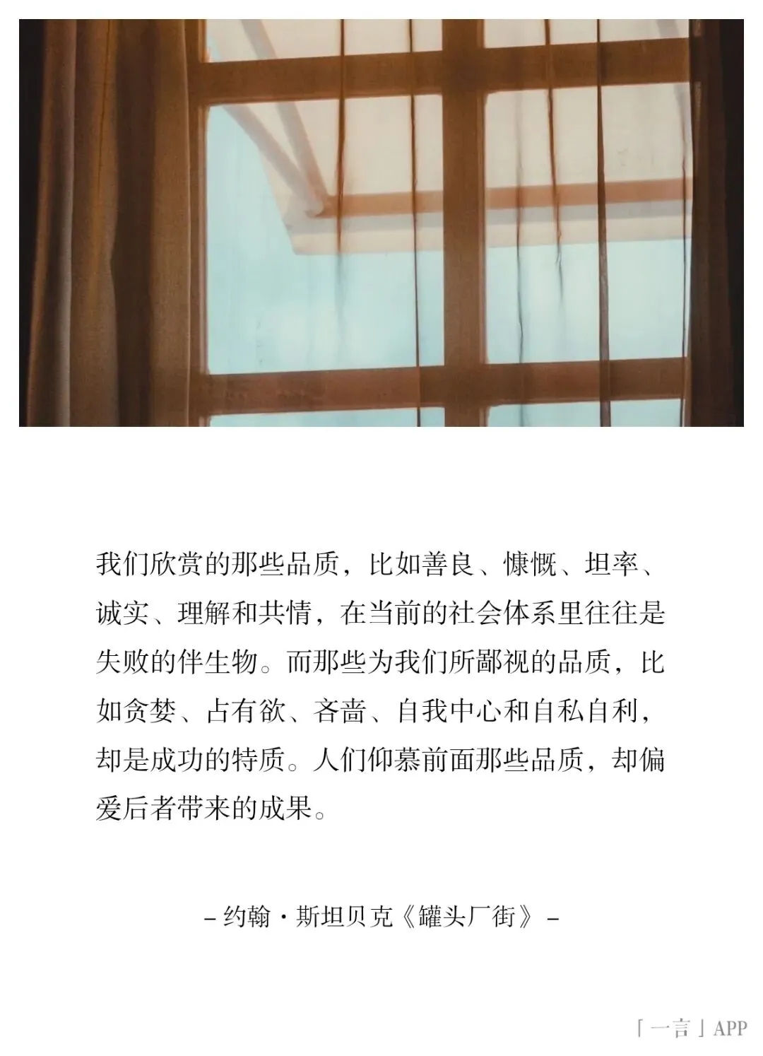 ●斯坦贝克这段话,精准刺穿了现代社会的道德悖论:我们嘴上供奉着善良、诚实、共情等“美德”,但整个社会运行的奖惩机制却实实在在地奖励着贪婪、自私与占有欲。