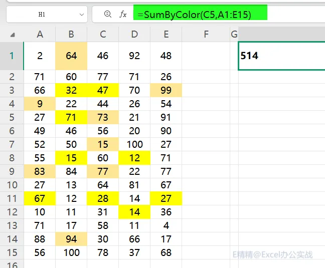 =SumByColor(C5,A1:E15)