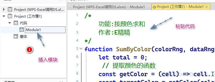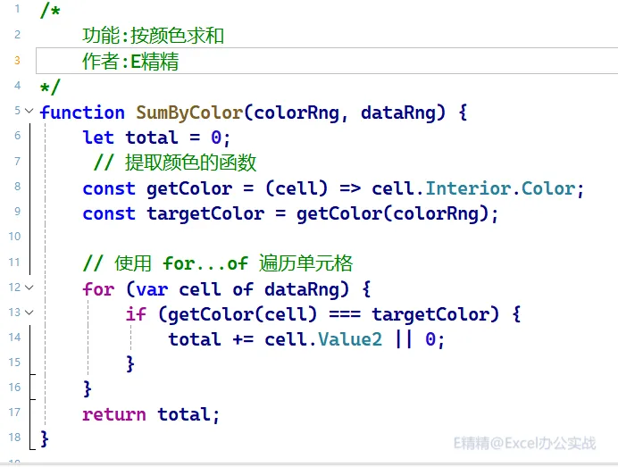 /*功能:按颜色求和作者:E精精*/functionSumByColor(colorRng, dataRng) {let total = 0;// 提取颜色的函数const getColor = (cell) => cell.Interior.Color;const targetColor = getColor(colorRng);// 使用 for...of 遍历单元格for (var cell of dataRng) {if (getColor(cell) === targetColor) {total += cell.Value2 || 0;}}return total;}