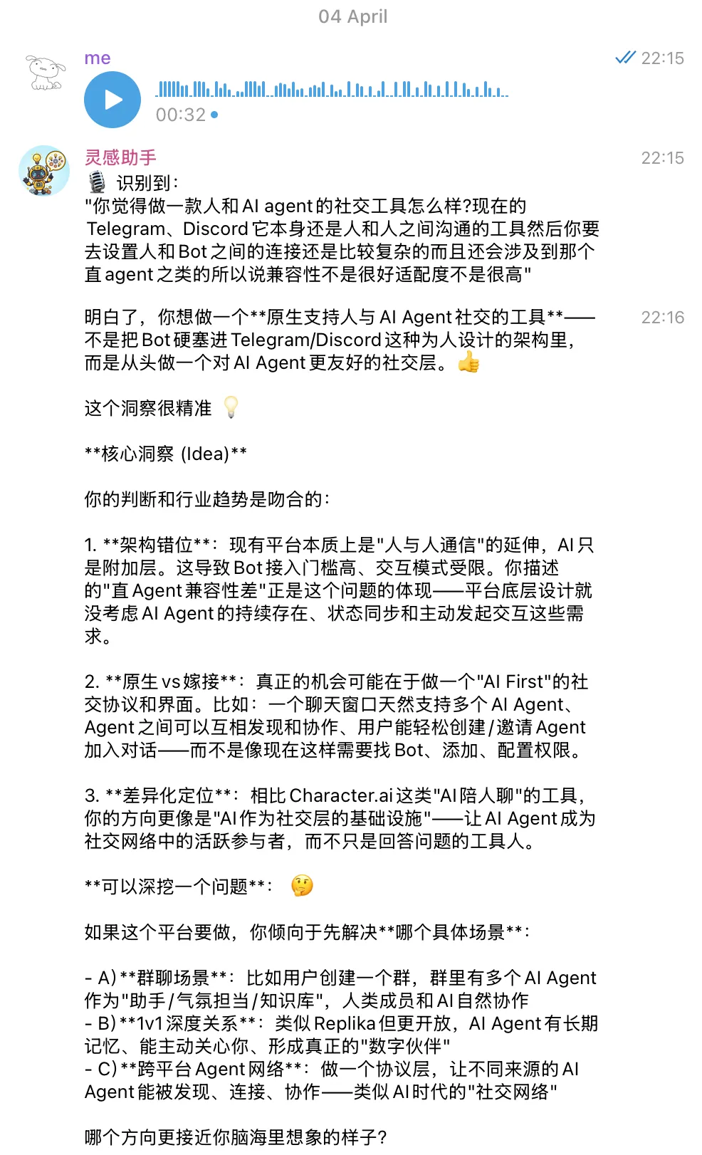 目前大家和 Agent 的对话,都不是通过主流社交软件完成的。要么是各家模型厂商的 Agent 工具,比如 Claude APP、Gemini CLI;要么是通过 Discord、飞书等非主流的工作沟通软件。