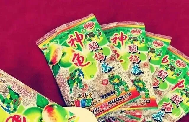 这个绿油油的酸梅粉袋给孩子们造梦,印着大龟和大梅子,拆开倒一点到手心,酸得眼睛眯成一道缝,小塑料勺子形状花样多,能攒好几把,有人粉都吃净了就等着收集个全,放现在,连酸梅粉也不会有以前那劲儿了,袋子亮,梅味却淡多了。