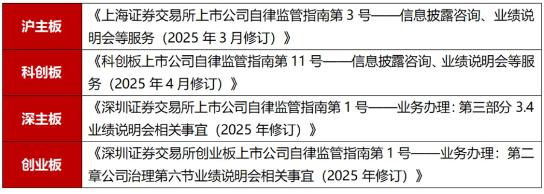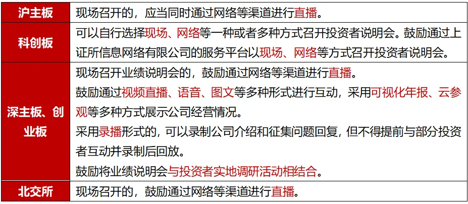 沪主板、科创板均要求在年报披露后及时召开业绩说明会,深主板、创业板则不强制,建议纳入沪深300指数、“A+H”上市公司、央企控股上市公司、创业板上市公司在年报披露后及时召开业绩说明会,其他上市公司鼓励召开。北交所未在2025年年度报告披露工作的通知中规定,但在《股票上市规则》明确要求,北交所公司应当在不晚于年度股东会召开之日举办年度业绩说明会。