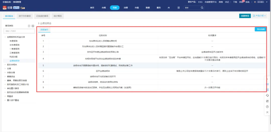 业绩说明会召开流程可参考“易董-信披-事项智库”,这里以深主板为例,流程参考下图: