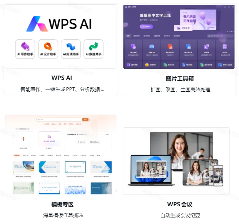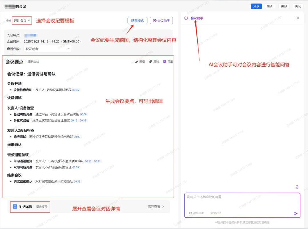 WPS会议具备共享屏幕、视频、录制等功能。还可在会议里一键开启AI纪要,生成不同场景的纪要风格,脑图/文本模式自由切换,并精细化设置可查看权限。