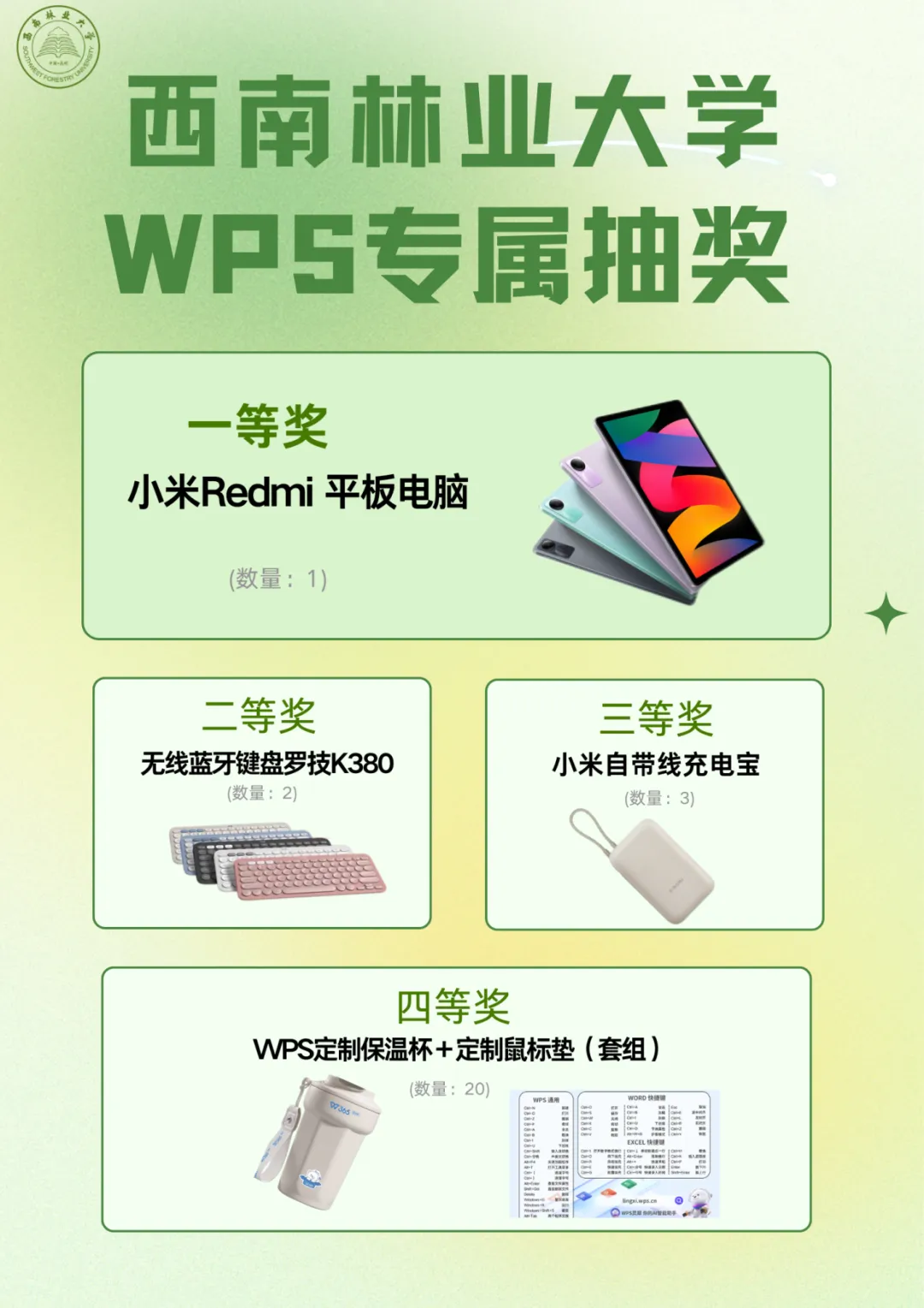 注:领奖时需提供转发朋友圈截图(所有人可见)+已激活WPS西南林业大学账号登录截图。