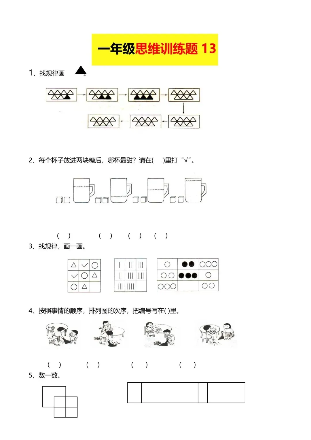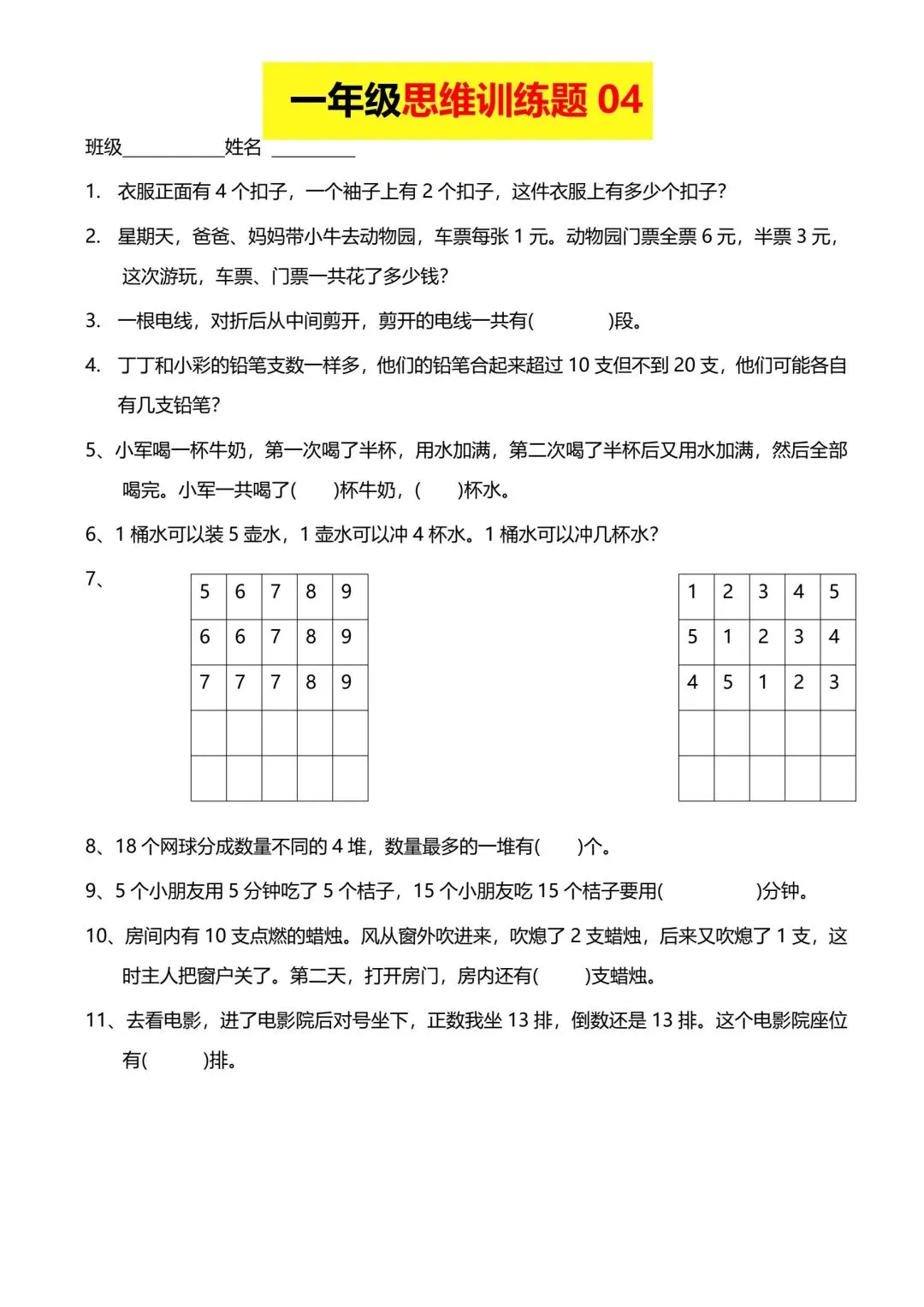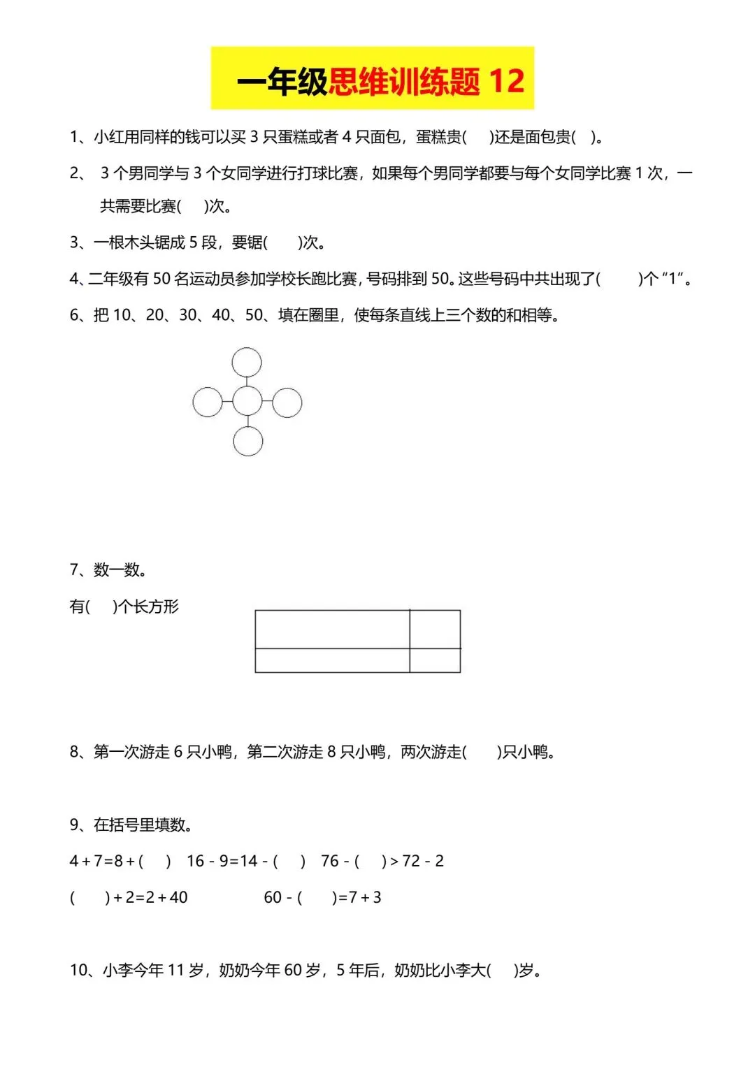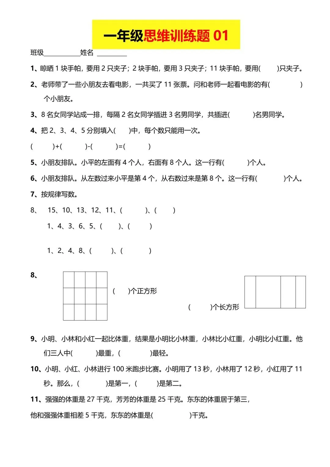 一年级(下)数学 思维训练题13套,电子版可下载免费