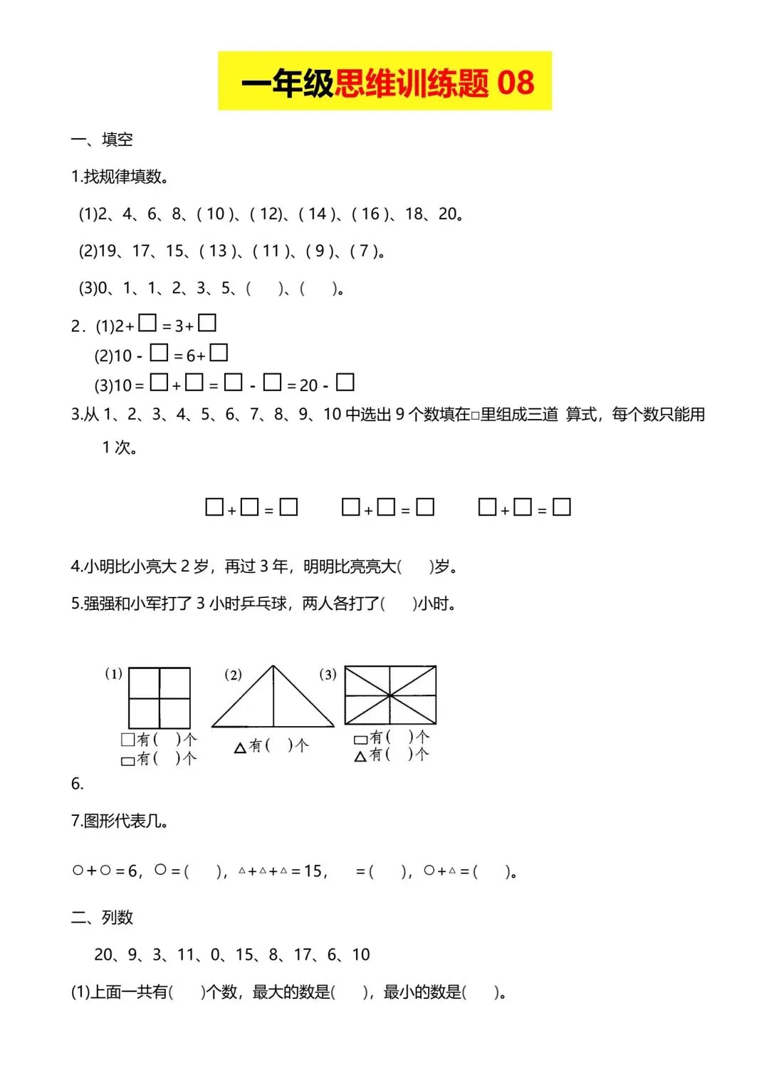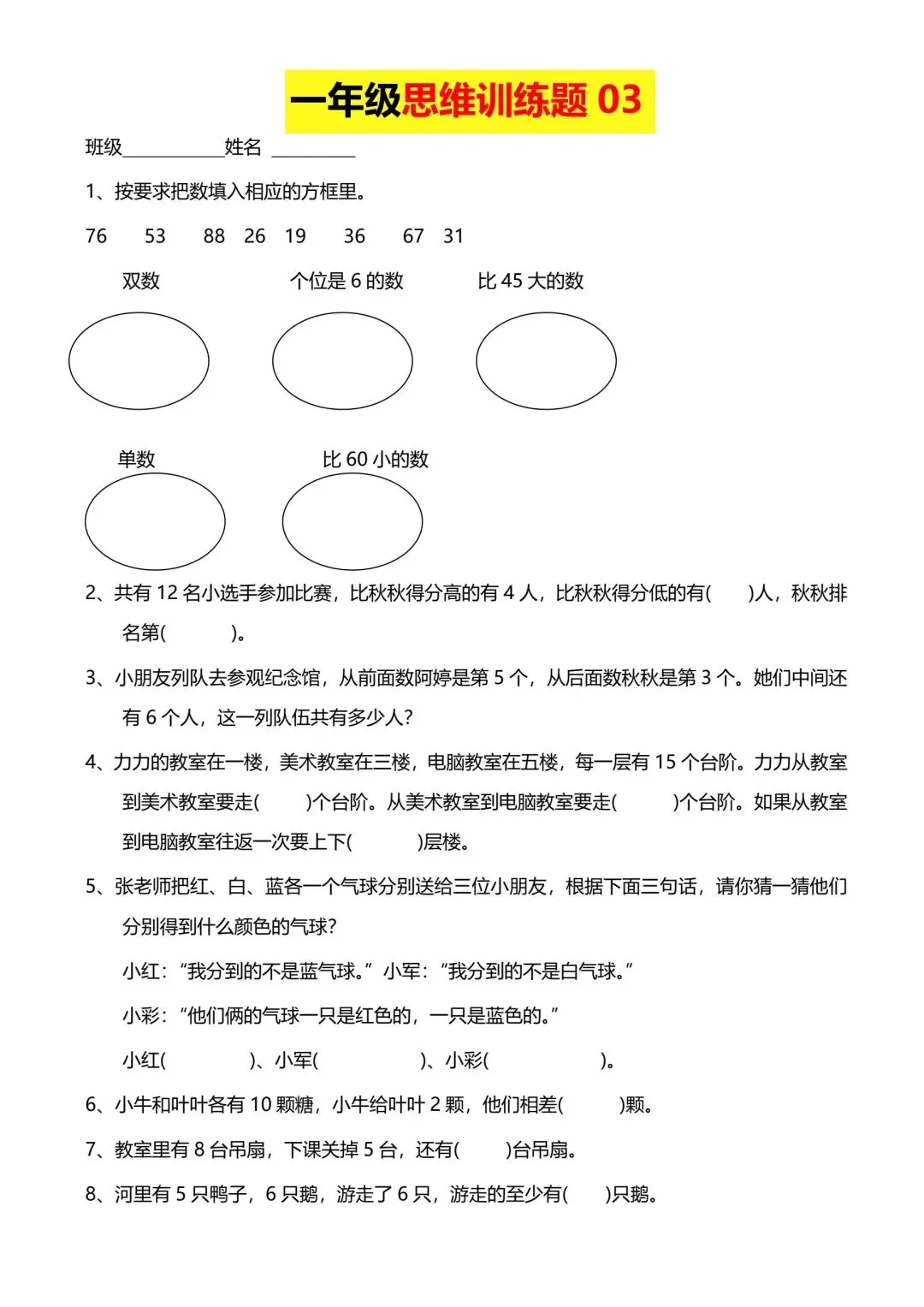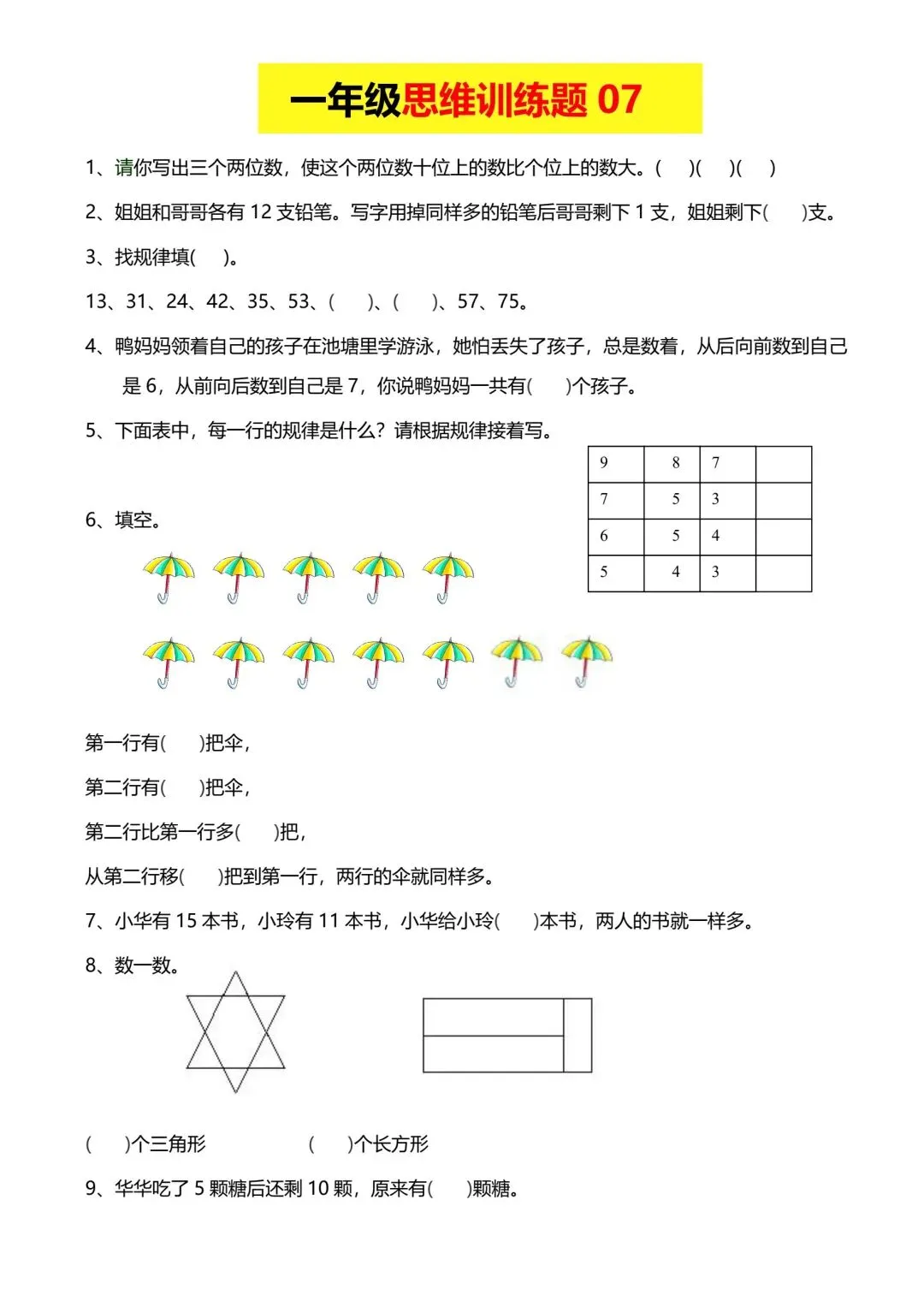 一年级(下)数学 思维训练题13套,电子版可下载免费
