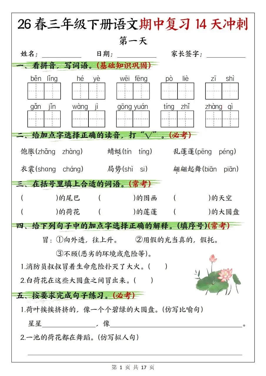 这是2026春三年级下册语文期中14天冲刺复习资料,共14天每日练习,涵盖看拼音写词语、字音辨析、形近字组词、词语运用、句子仿写、古诗文默写、寓言成语、课文理解与修改病句等必考题型,配套完整答案,贴合期中考点,适合每日打卡巩固。