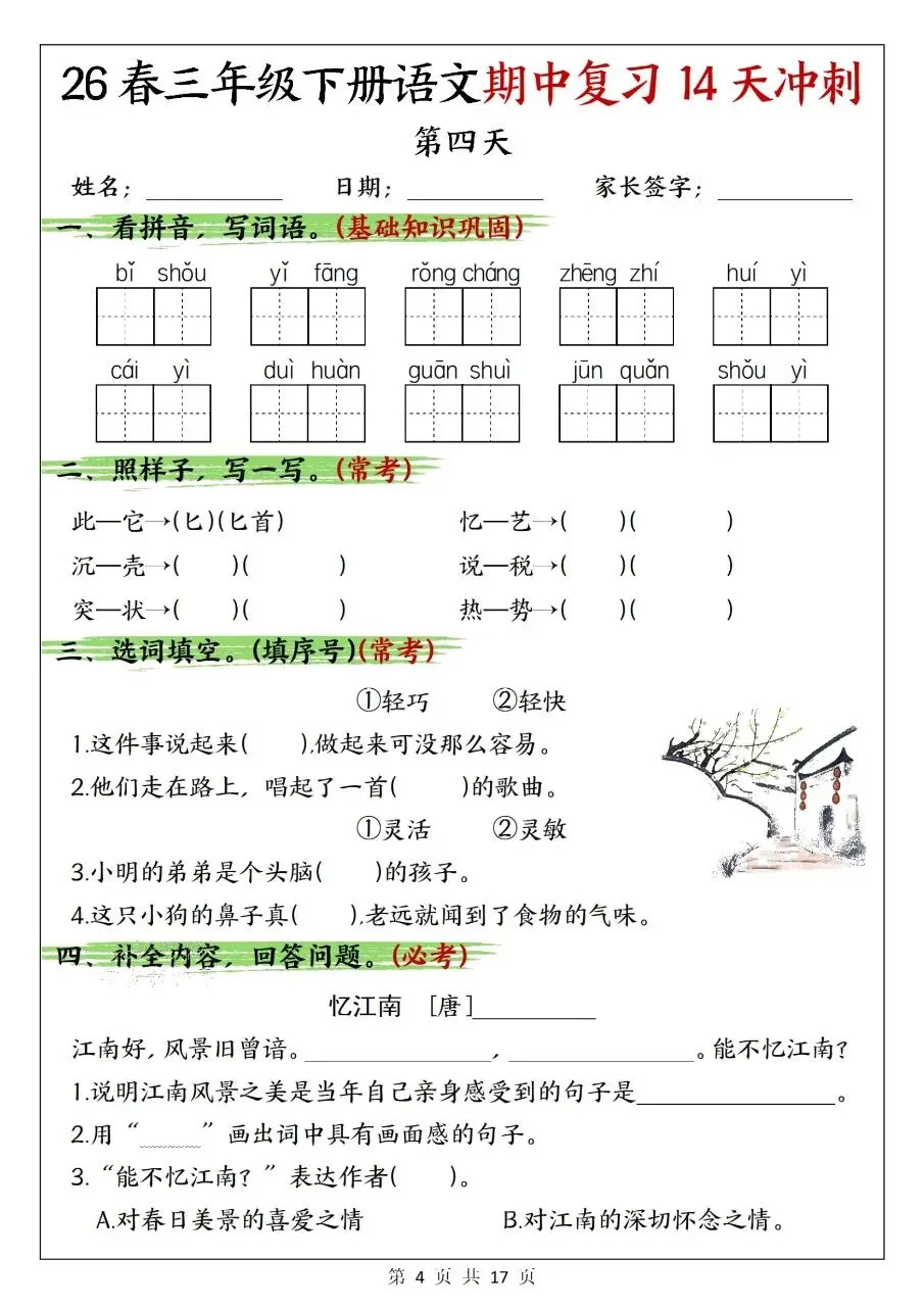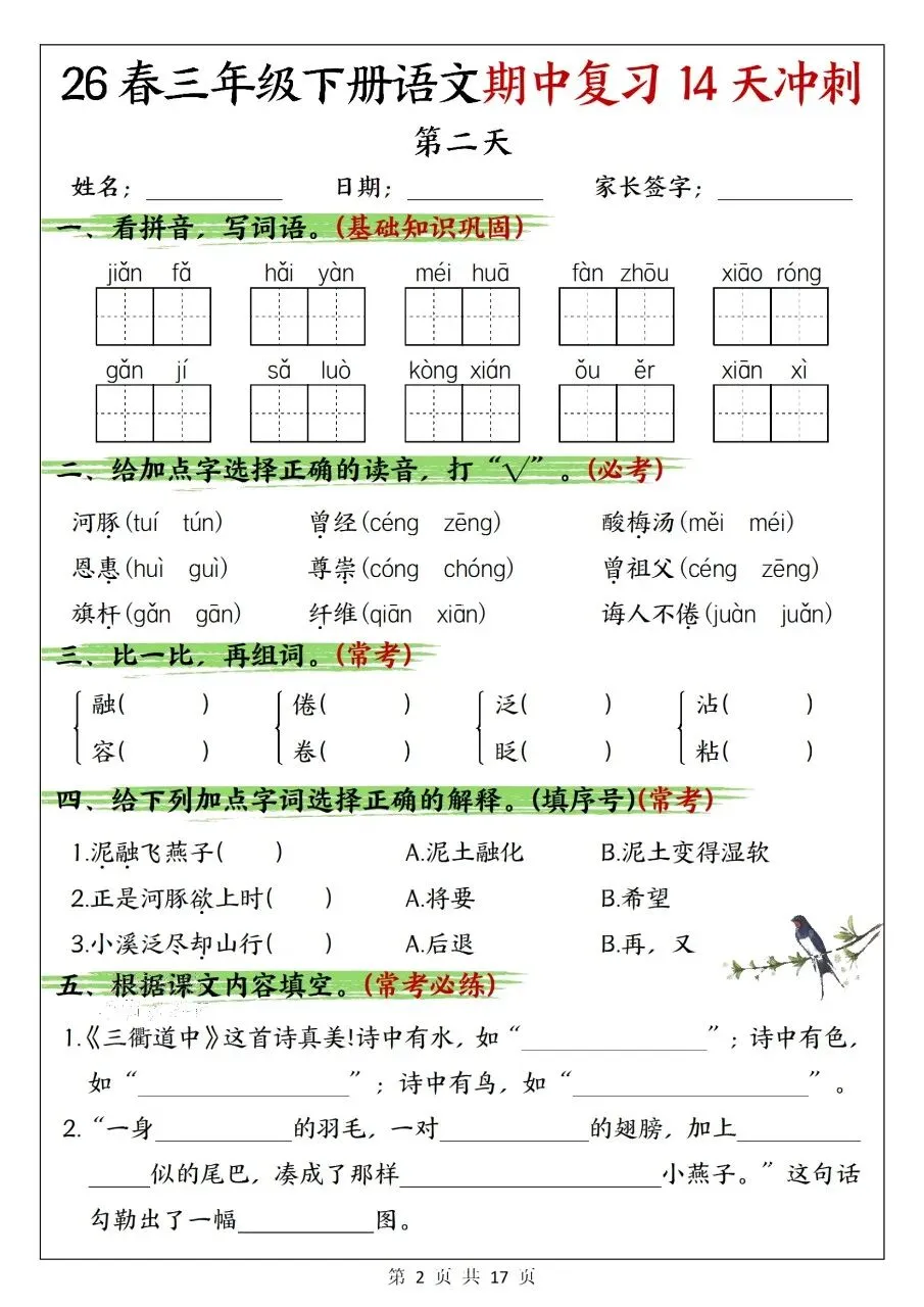 三年级下册语文|期中复习 14 天冲刺(可下载打印)