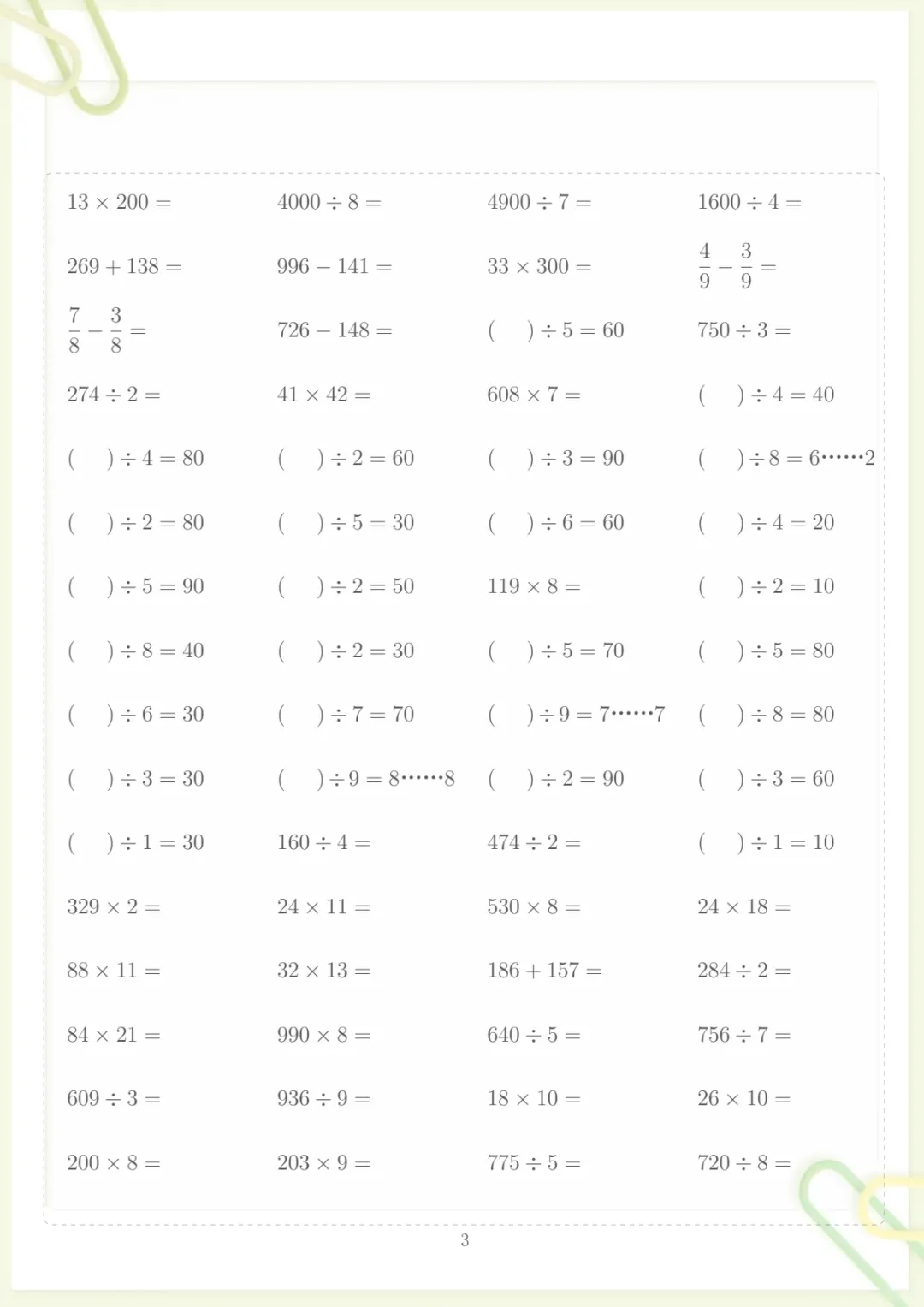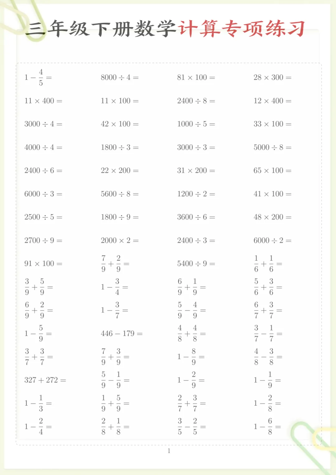 三年级下数学计算专项练习,电子版可打印