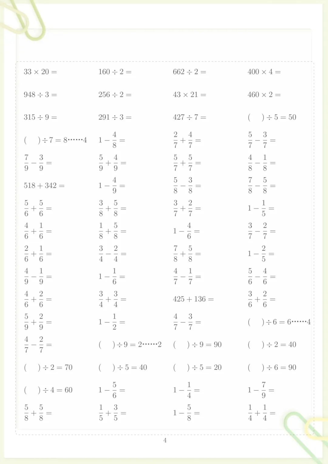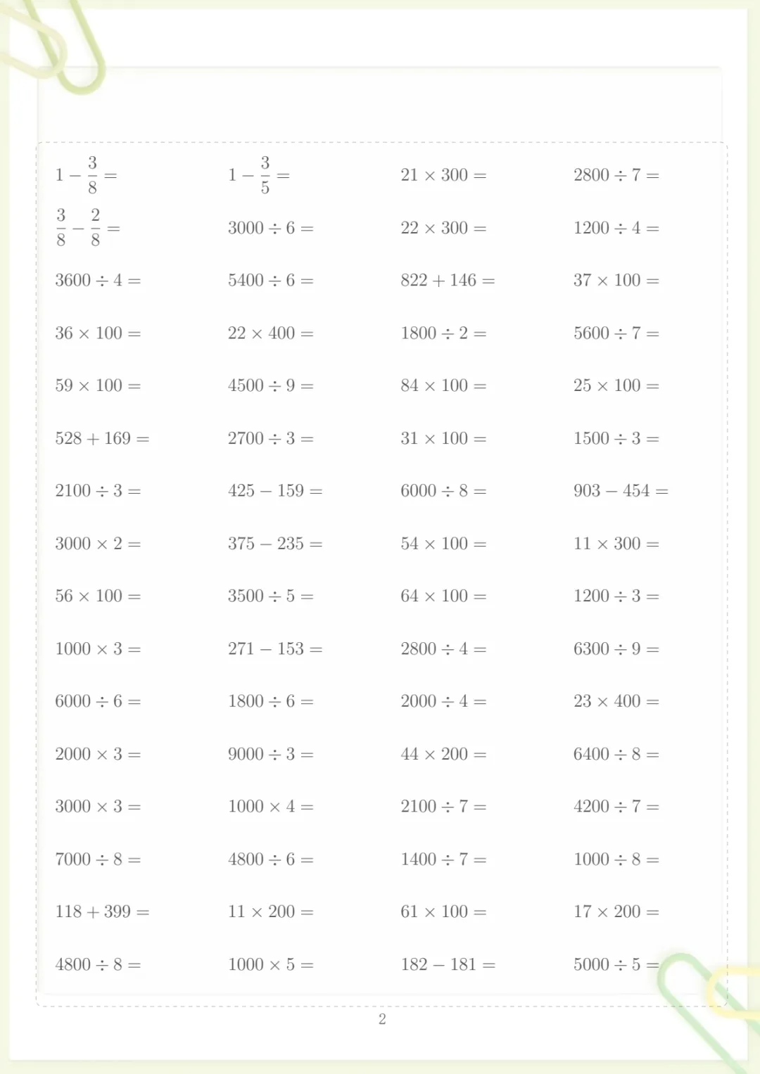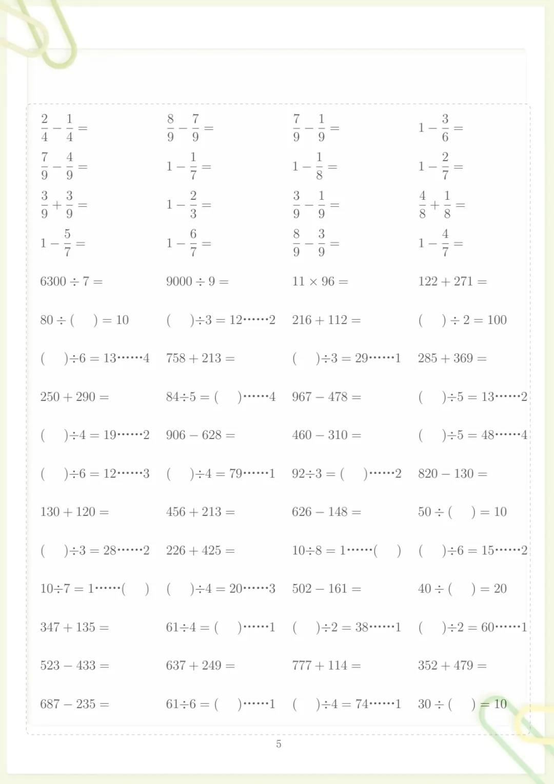 三年级下数学计算专项练习,共110页,电子版可下载可打印,这份资料围绕三年级下册数学计算能力提升设计,涵盖多个核心知识点与专项训练内容,题量充足、练习系统,适合孩子在日常巩固、查漏补缺和阶段提升时使用,帮助进一步夯实计算基础、提升做题速度与准确率。需要的家长可以及时下载打印出来,让孩子有针对性地练一练。