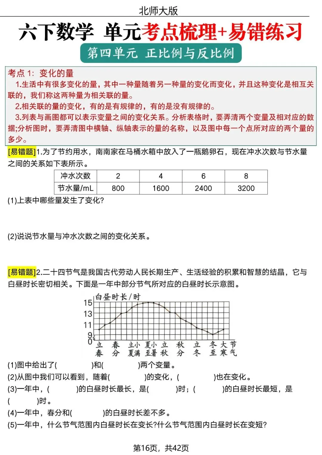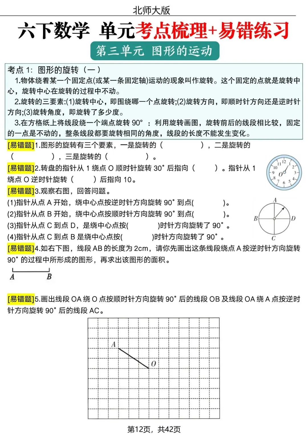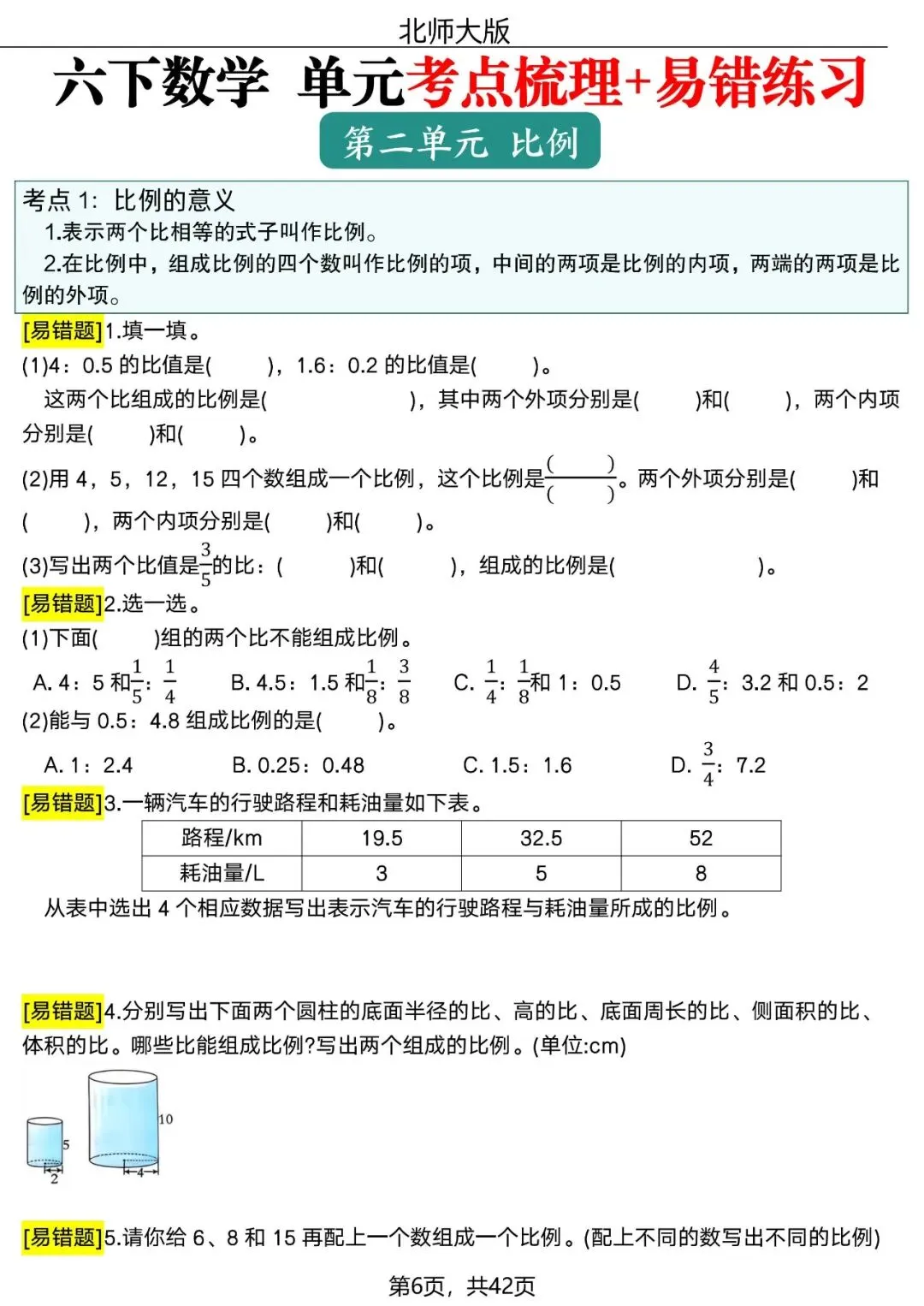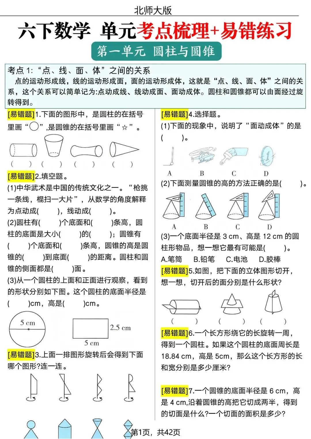 大家好,我是小敏妈妈,今天为大家分享的是;2026年春六年级下册北师大版数学《全册重点必背知识点归纳整理+易错专项训练》 有答案共42页,完整电子版可打印