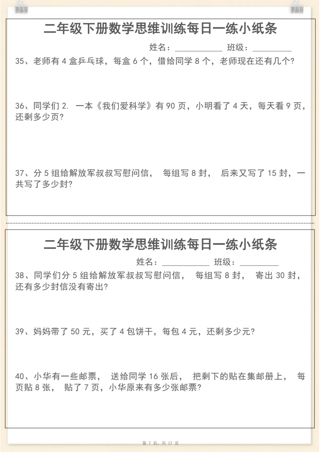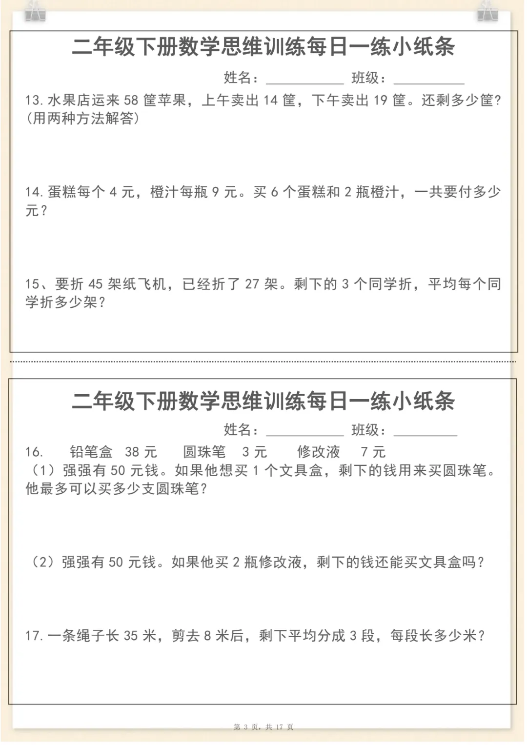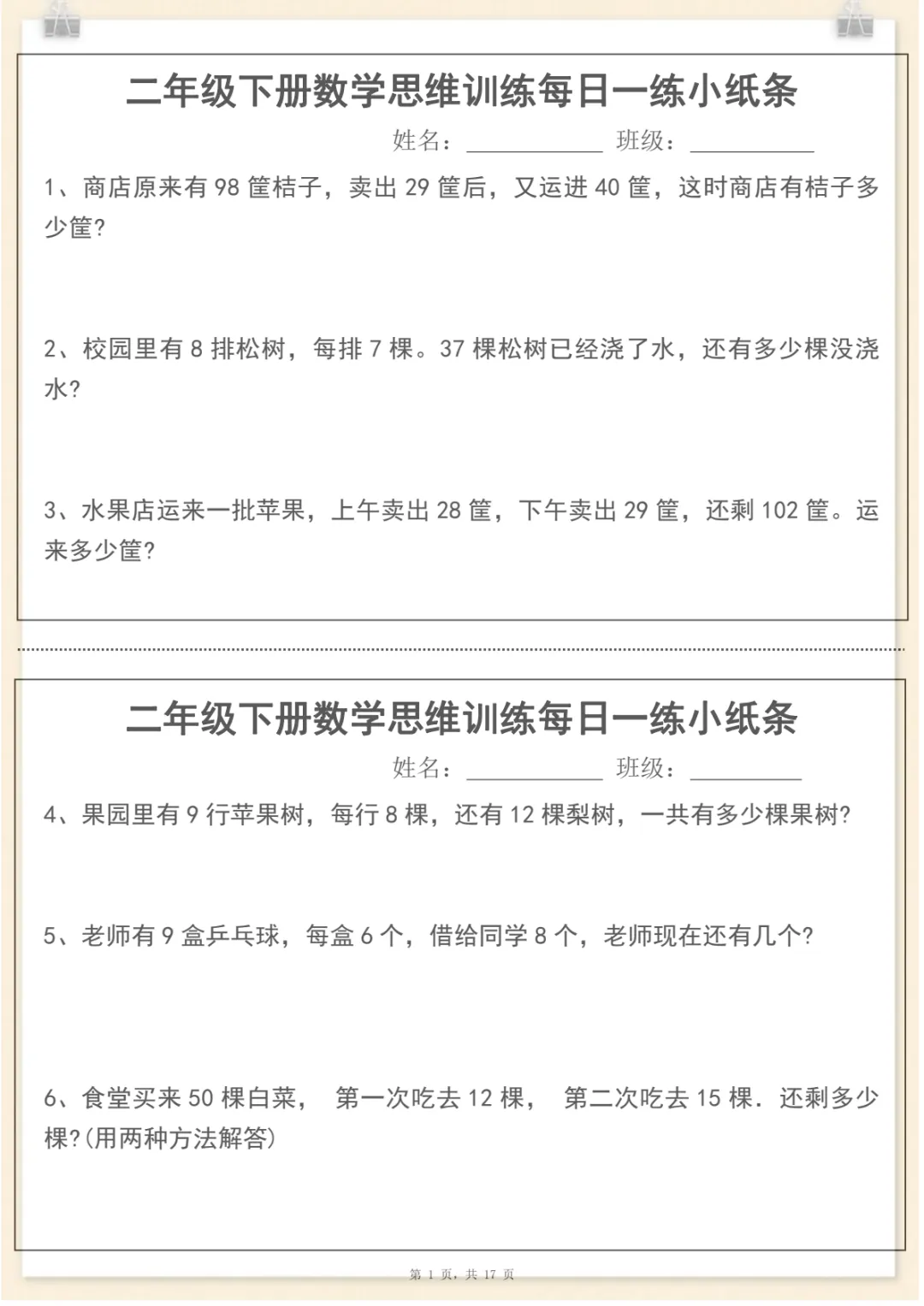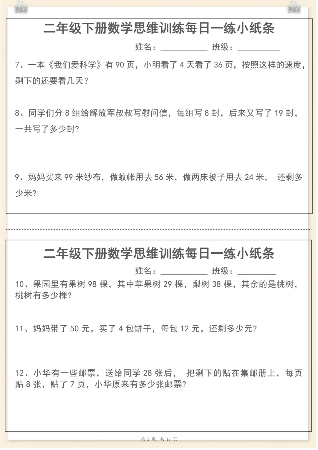 二年级下数学思维训练每日一练小纸条,共17页,电子版可下载可打印,这份练习资料围绕二年级下册数学思维训练设计,涵盖多个核心知识点与专项训练内容,题量安排更适合孩子进行每日巩固与循序渐进练习,帮助孩子在计算、理解、分析和解决问题等方面逐步提升,进一步夯实课堂所学内容。需要的家长可以及时下载打印出来,让孩子每天练一练。