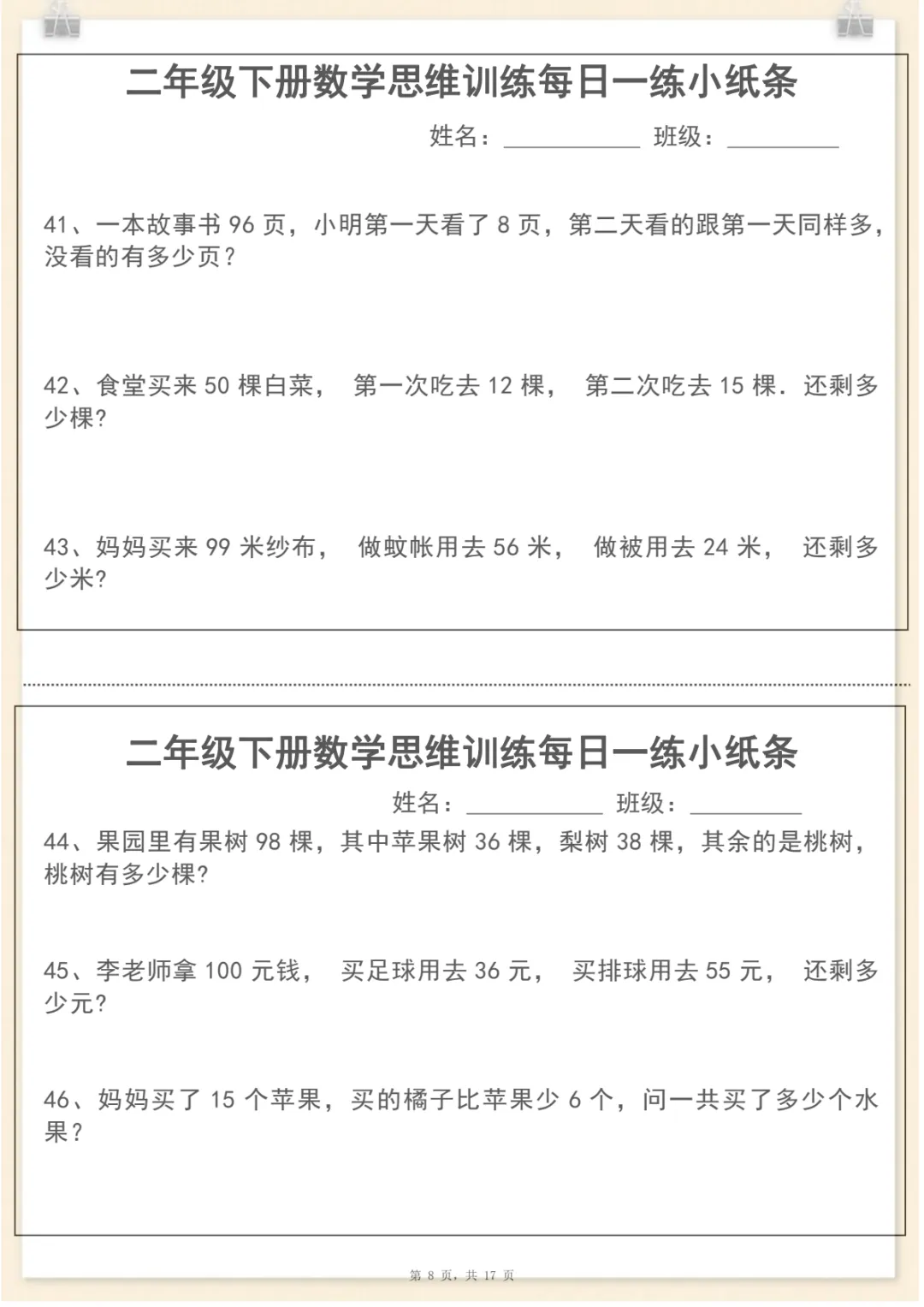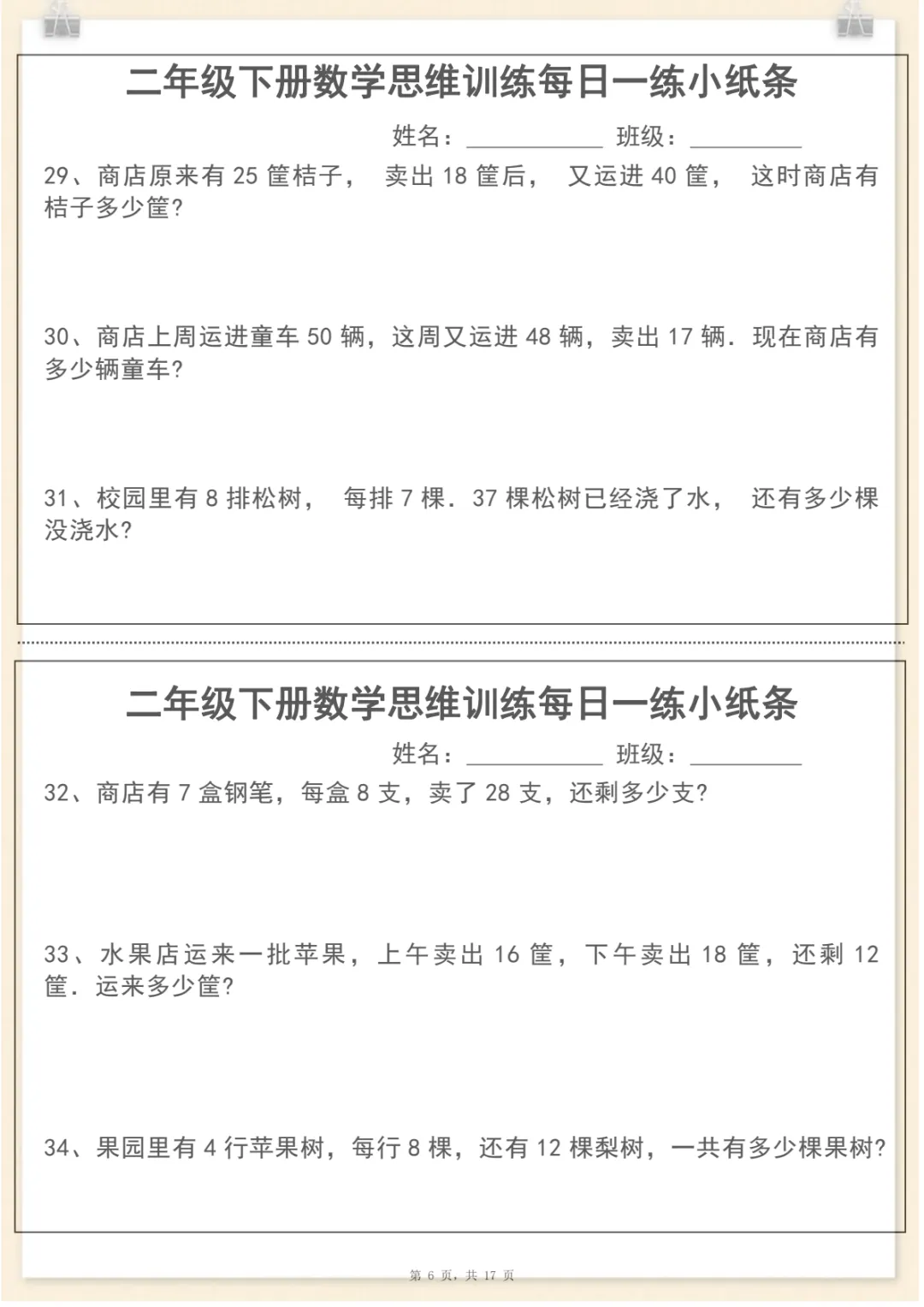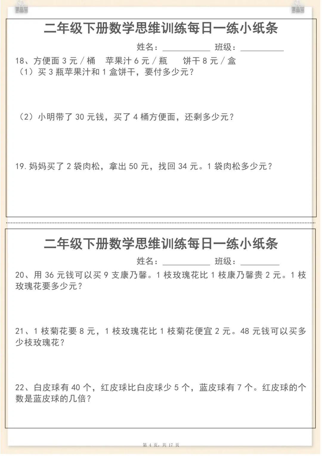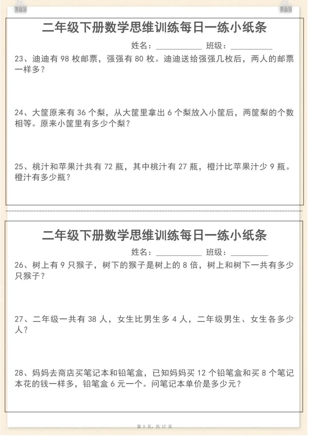 二年级下数学思维训练每日一练小纸条,共17页,电子版可下载可打印,这份练习资料围绕二年级下册数学思维训练设计,涵盖多个核心知识点与专项训练内容,题量安排更适合孩子进行每日巩固与循序渐进练习,帮助孩子在计算、理解、分析和解决问题等方面逐步提升,进一步夯实课堂所学内容。需要的家长可以及时下载打印出来,让孩子每天练一练。
