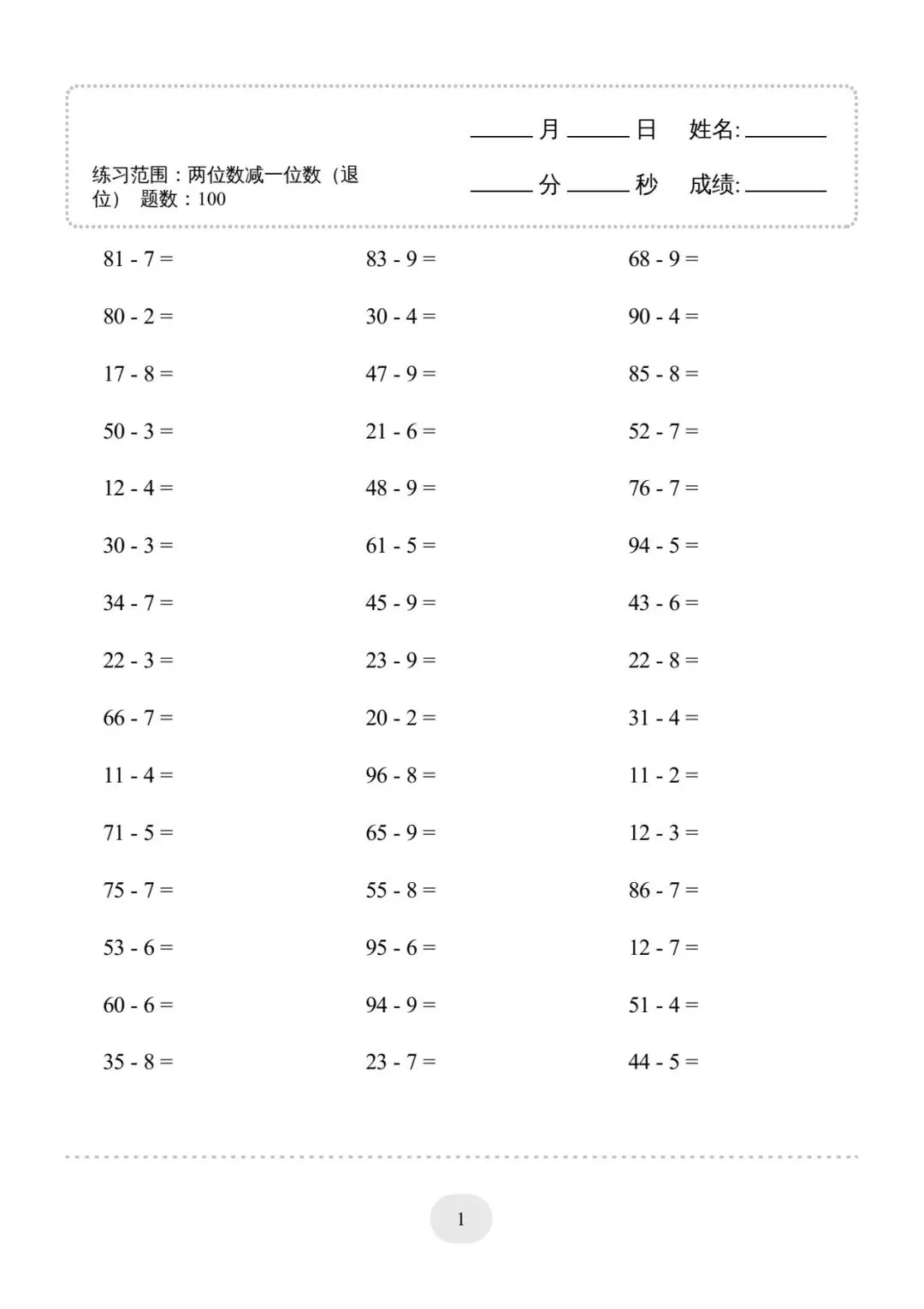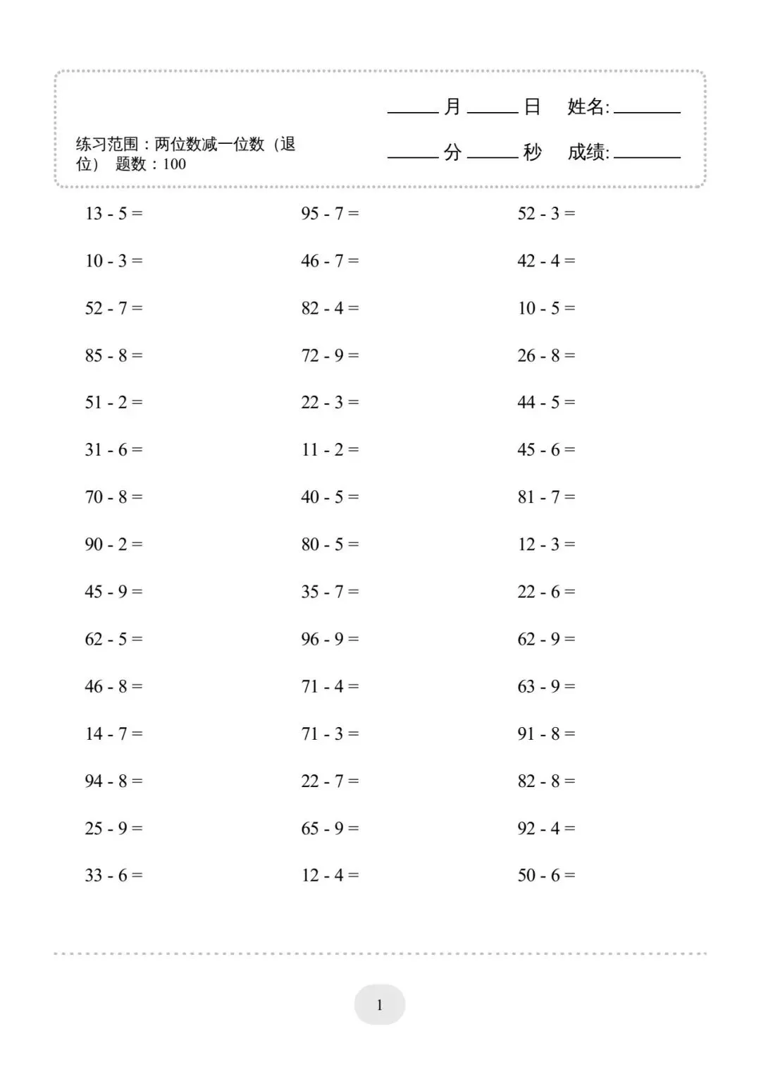 口算大全练习两位数减一位数退位减法,电子版可打印