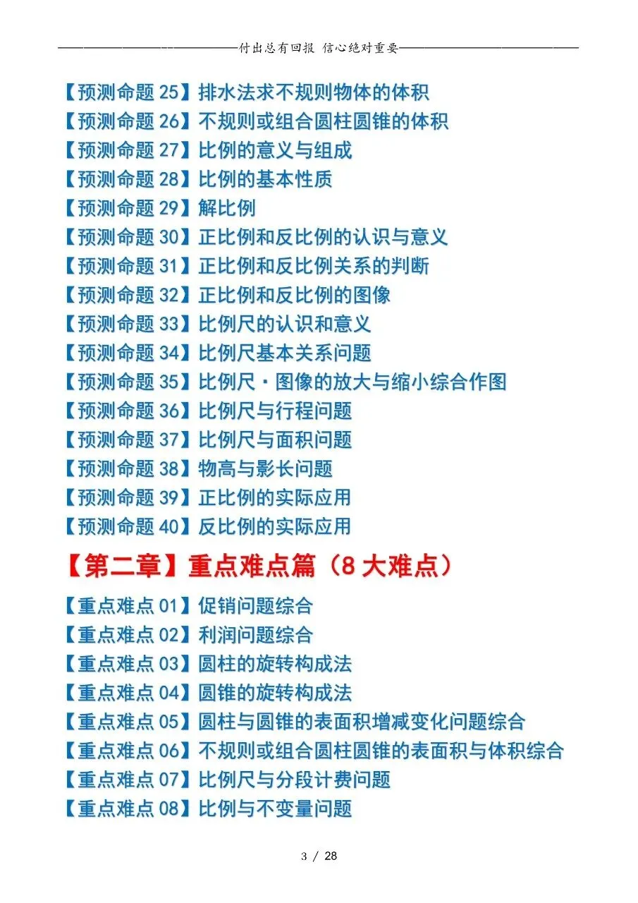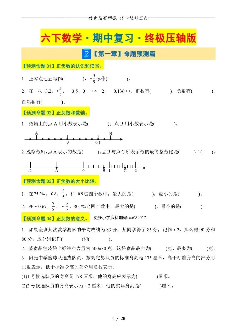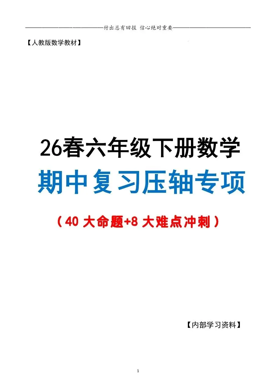 这是2026春六年级下册数学期中终极压轴复习资料,包含40大命题预测和8大难点突破,覆盖正负数、百分数应用、圆柱圆锥、比例、比例尺、促销利润、分段计费等期中核心考点,配套典型例题与详细解析,针对性强,适合期中冲刺提分。