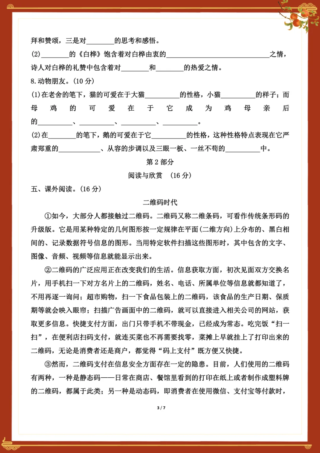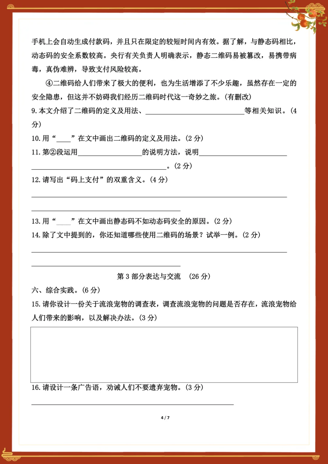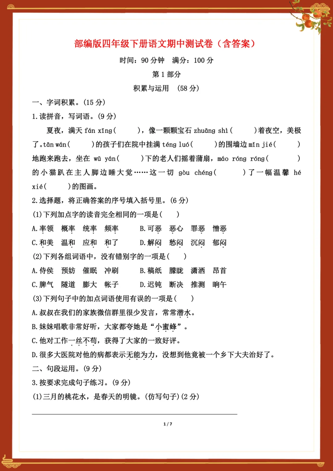 部编版四年级下册语文期中测试卷(含答案)电子版可下载