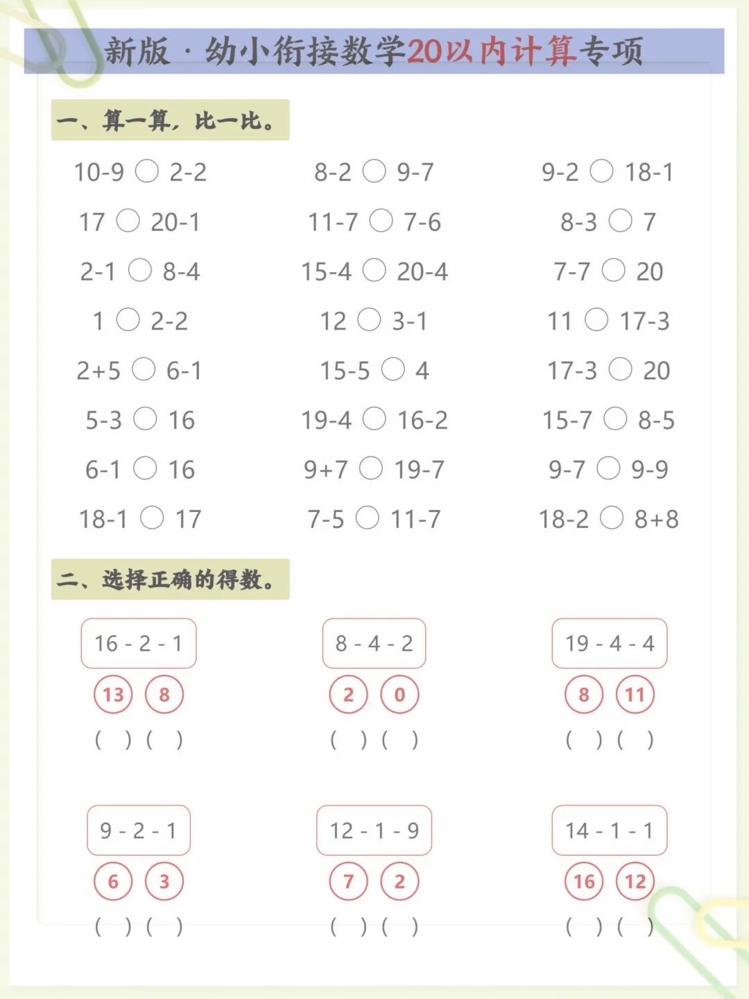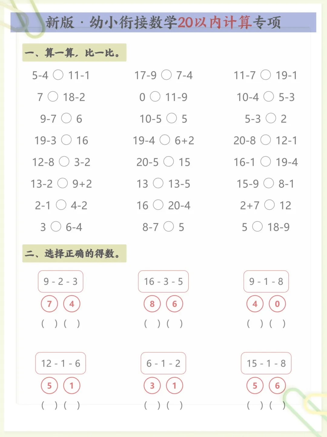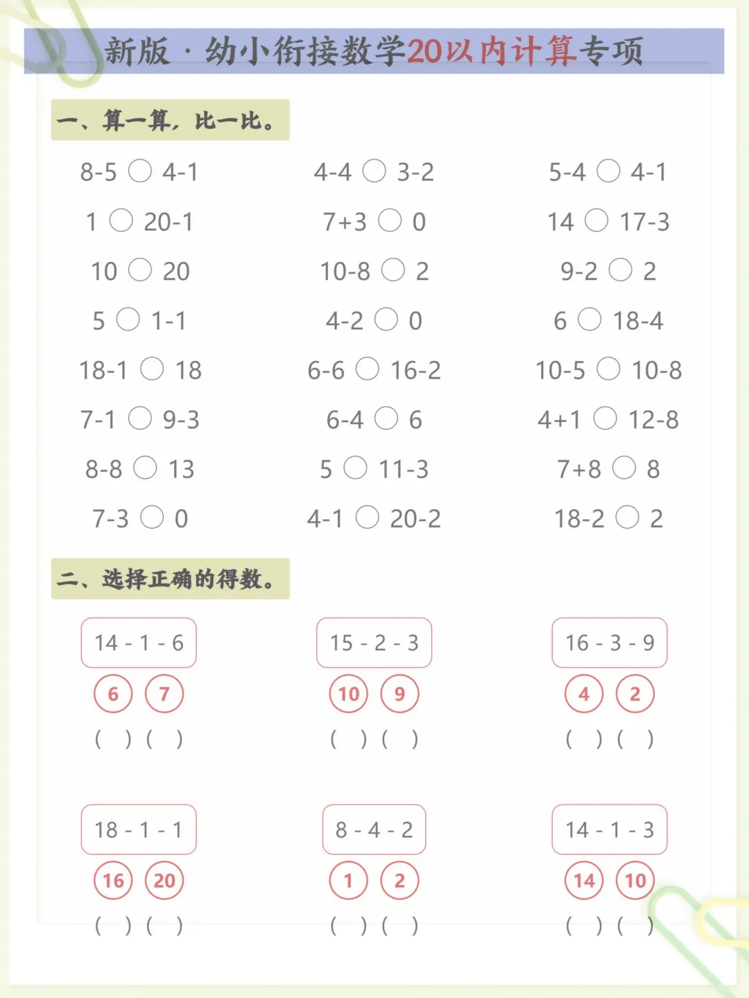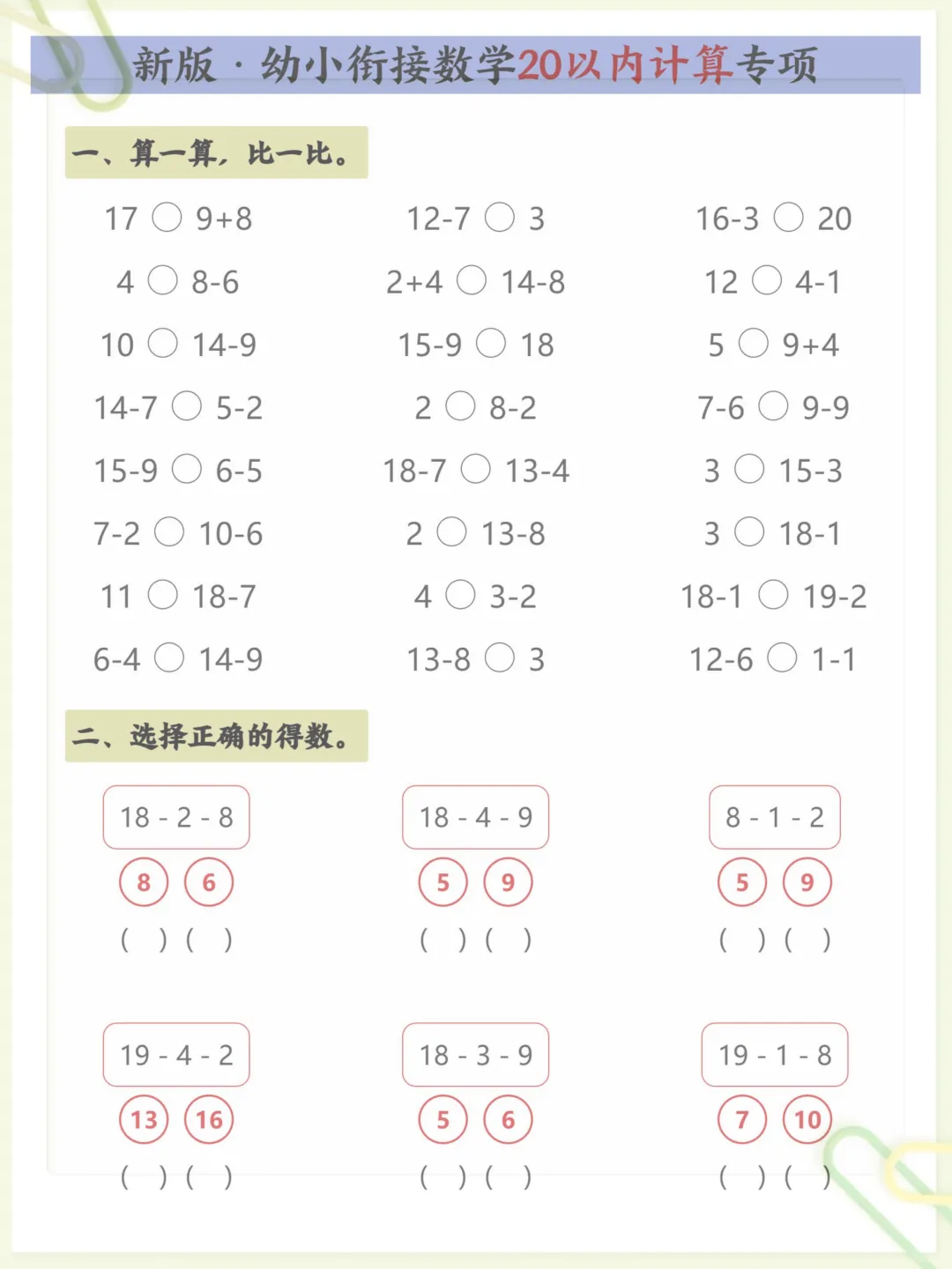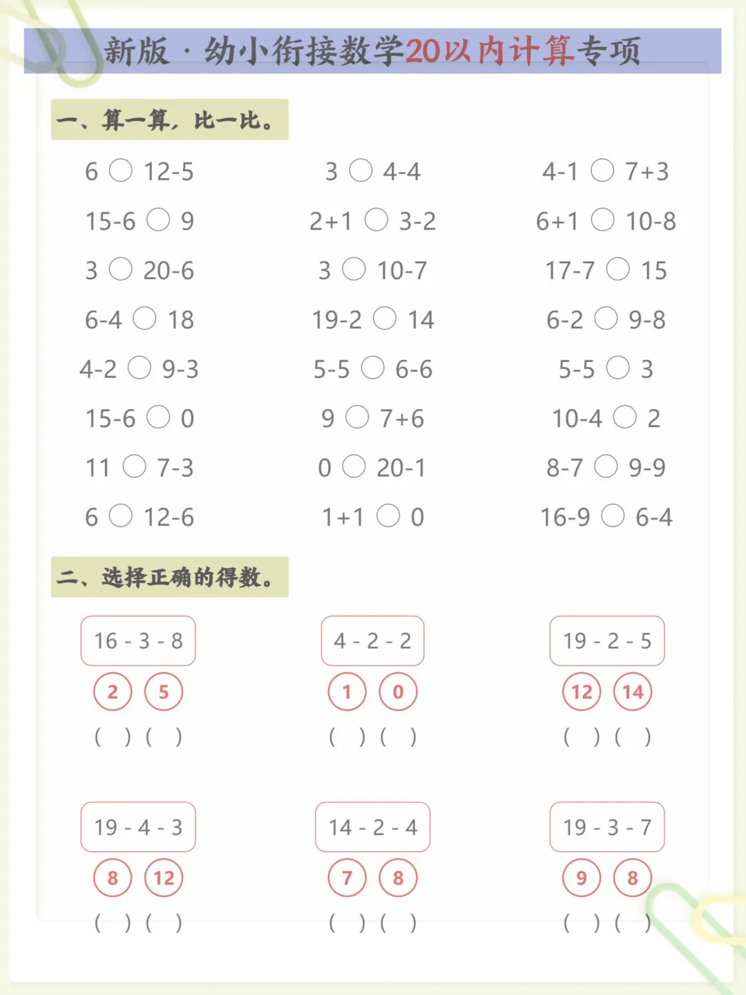 新版·幼小衔接数学20以内计算专项,共5页,电子版可下载可打印,这份资料围绕幼小衔接阶段常见的20以内计算训练进行编排,帮助孩子在练习中逐步巩固基础运算能力,熟悉计算方法,提升口算速度与准确率,内容紧扣入学前数学启蒙与衔接需求,适合家长在家配合孩子进行针对性练习。需要的家长可以尽快下载打印出来,让孩子练一练。